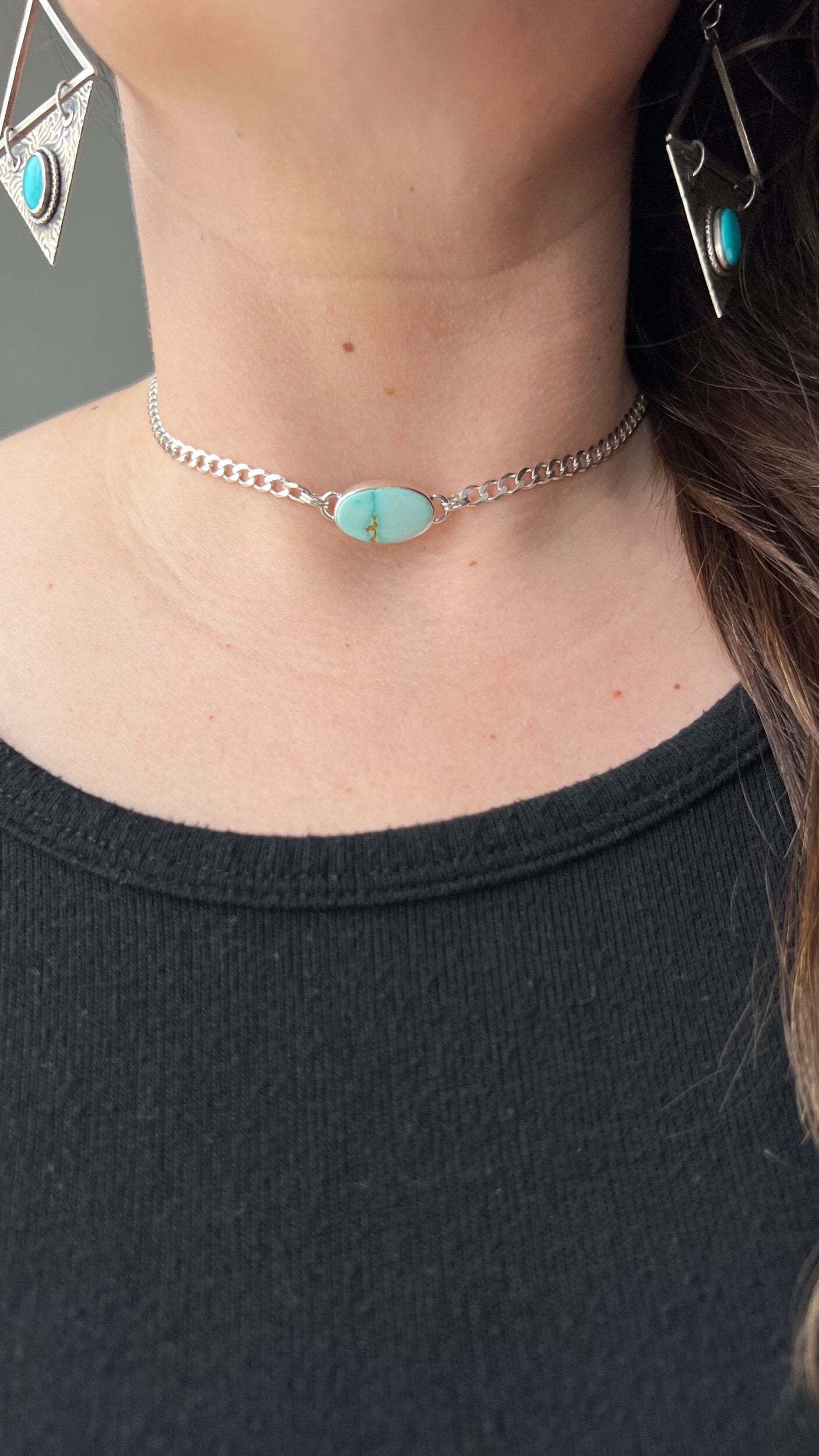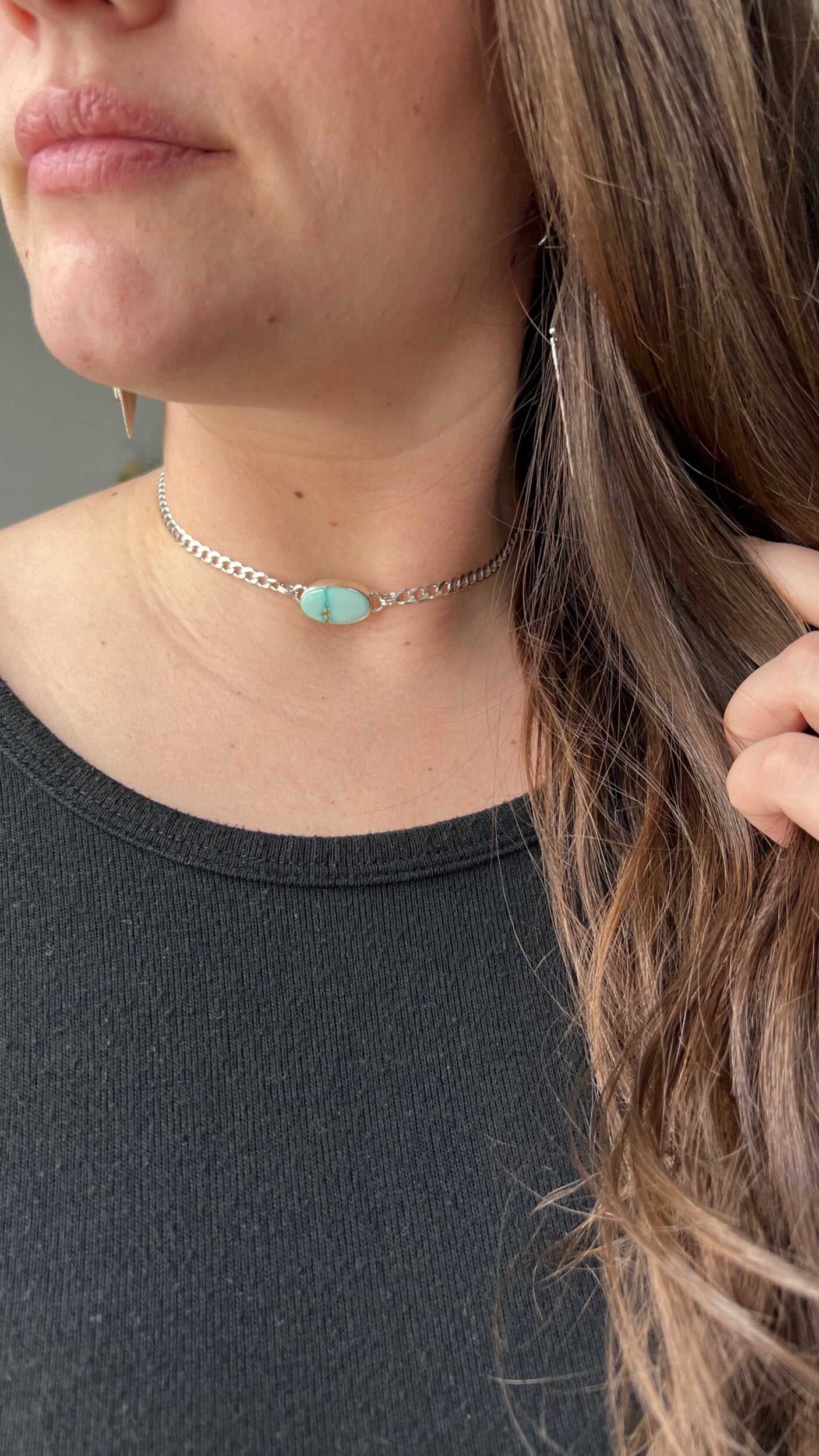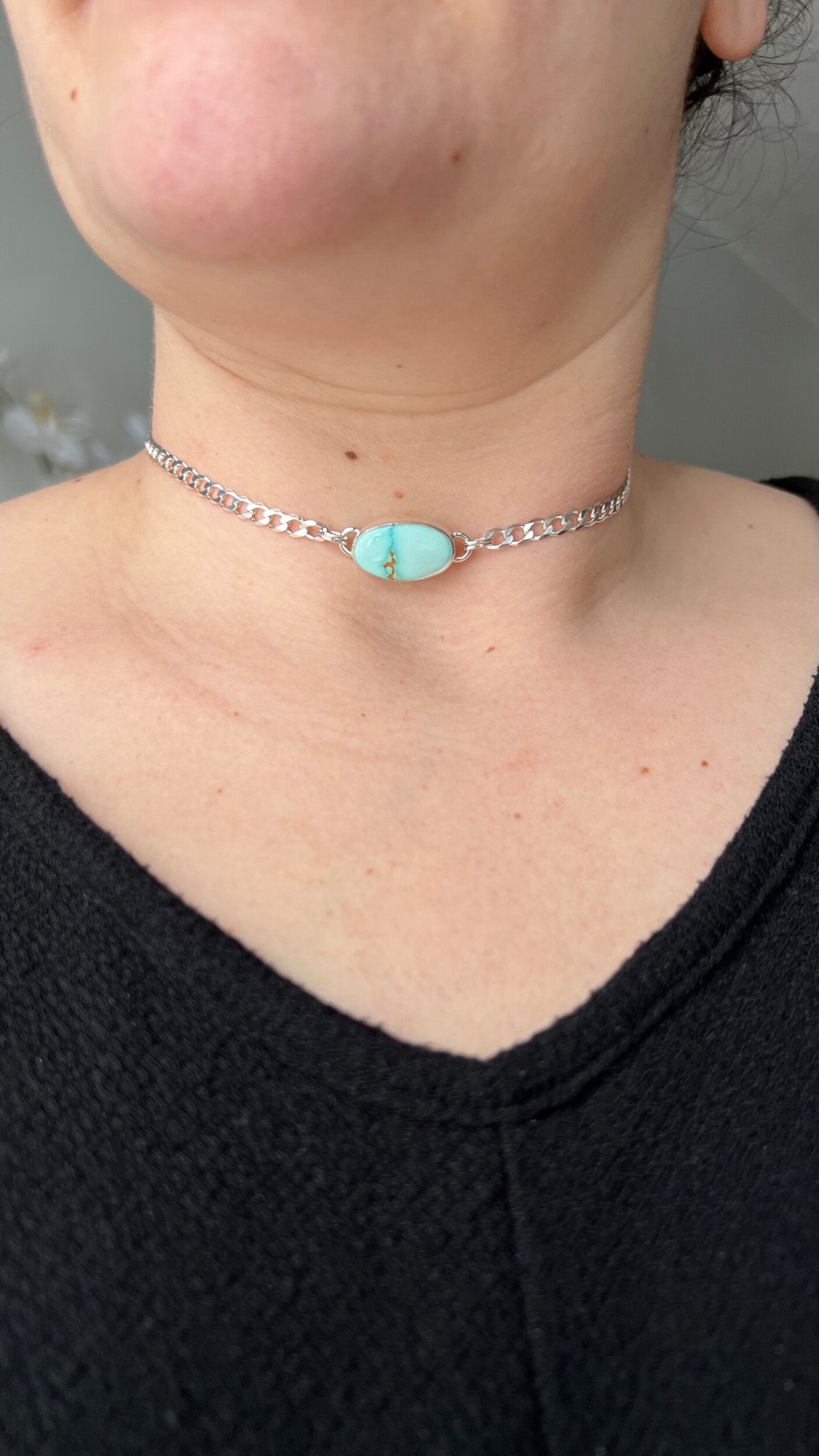 Bringing chokers back! This beautiful #8 turquoise stone is perfectly paired with a 4.5mm curb chain. Designed to be worn tight around the neck, this choker can be clasped down to fit your size perfectly.