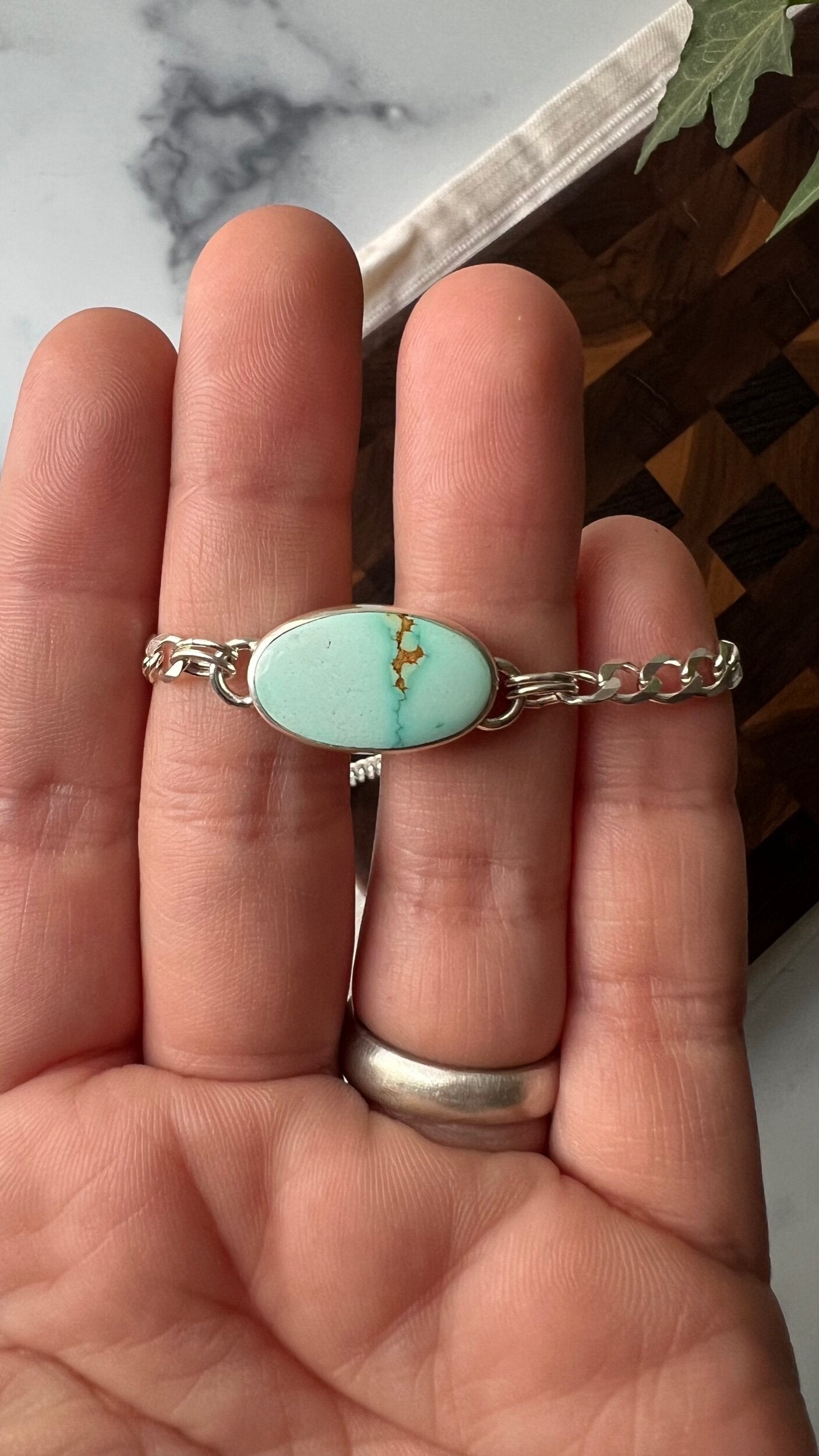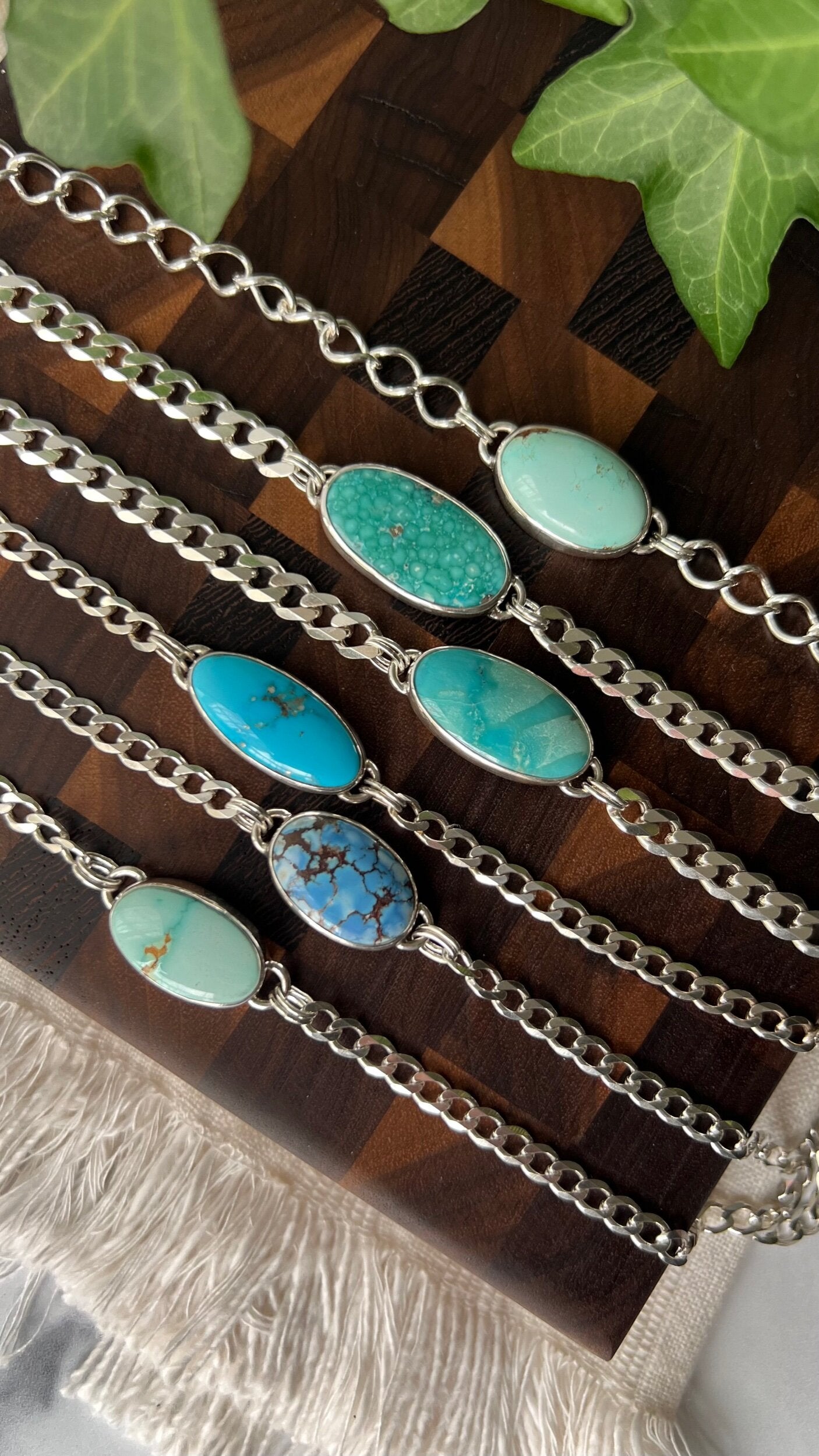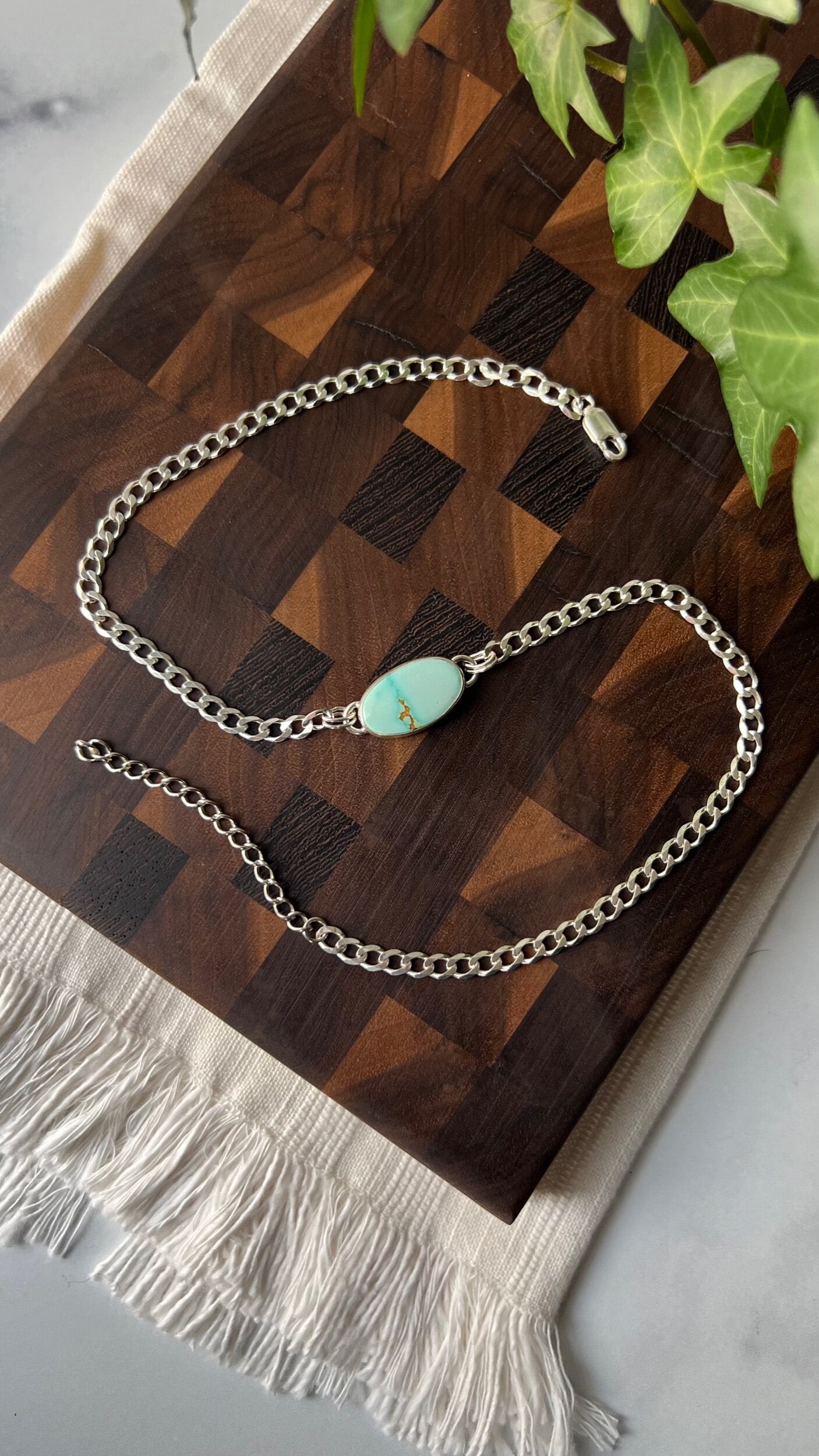 Bringing chokers back! This beautiful #8 turquoise stone is perfectly paired with a 4.5mm curb chain. Designed to be worn tight around the neck, this choker can be clasped down to fit your size perfectly.
