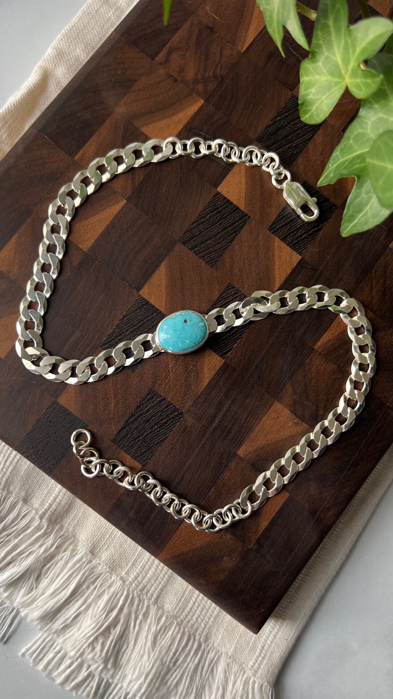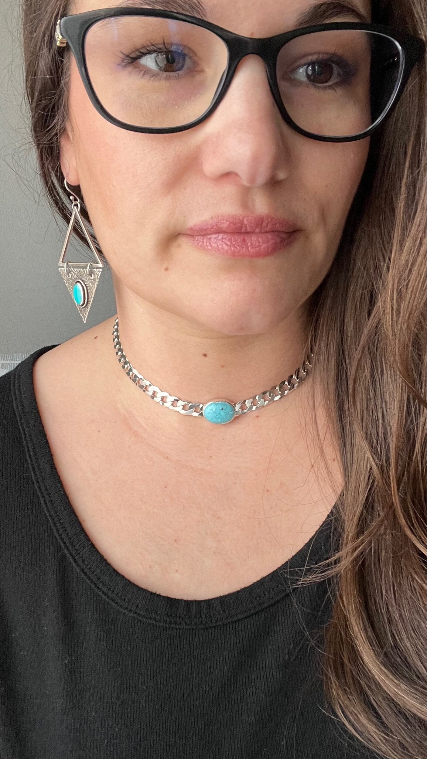 Bringing chokers back! This beautiful Castle Dome turquoise stone is perfectly paired with a 8 mm solid sterling silver curb chain. Designed to be worn tight around the neck, this choker can be clasped down to fit your size perfectly.