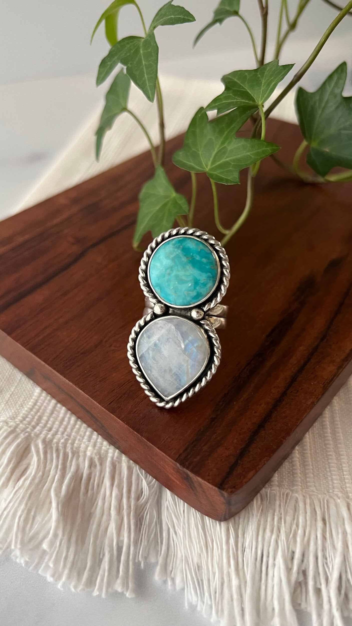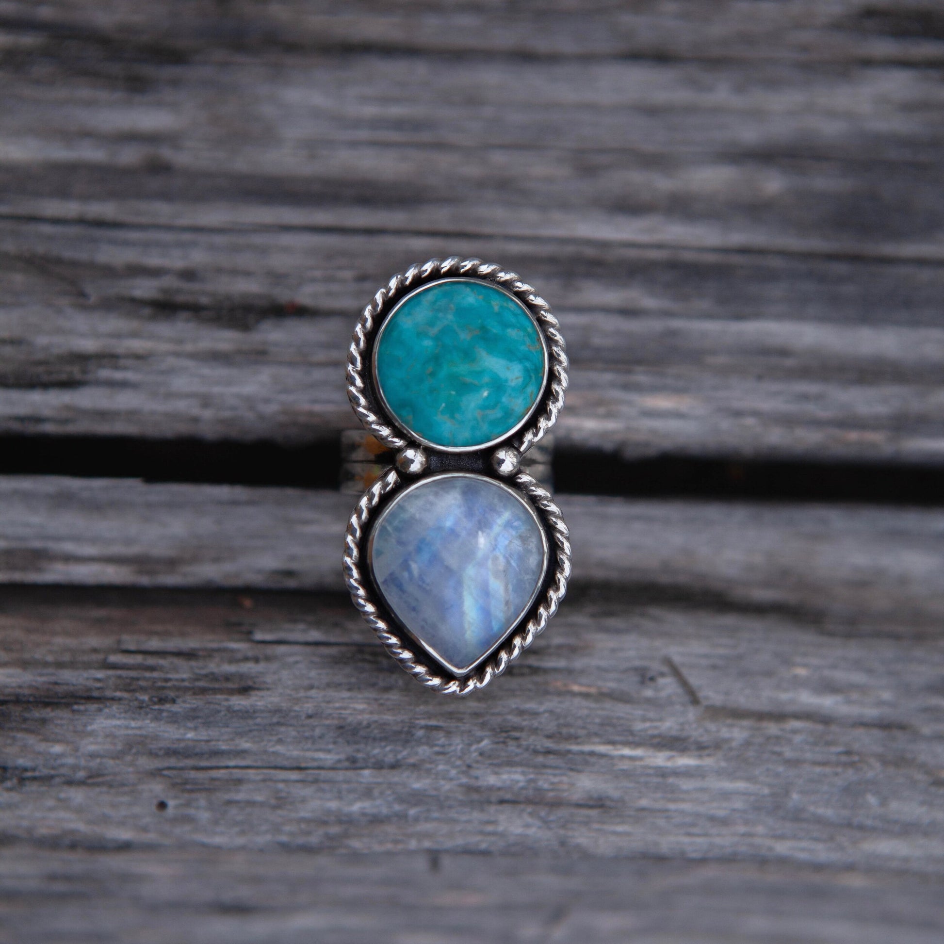 **Note: Item is discounted due to superficial crack on the moonstone. Crack should not affect the functionality/longevity of the ring.This Fox turquoise pairs perfectly with this beautiful moonstone. Wrapped in fine silver and bordered elegantly with a thick twisted wire. A statement ring for sure!