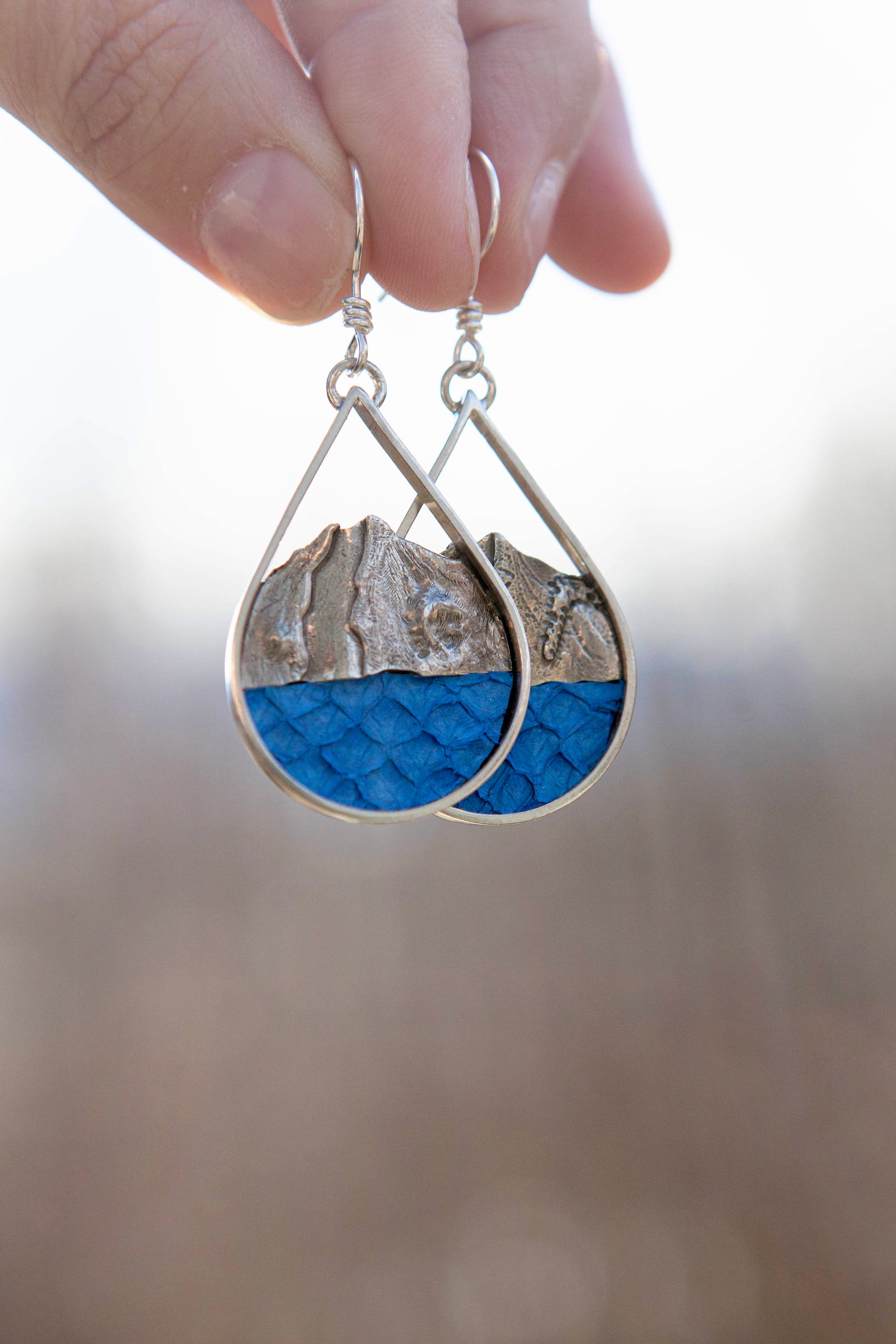 Embrace the wild beauty of nature with these one-of-a-kind sterling silver drop earrings! Inspired by the iconic Mt. Redoubt Volcano in Alaska, these earrings feature a unique dyed blue Alaskan salmon leather inset forming the inlet. Sterling silver was had forged to mirror the stunning, dramatic silhouette of the volcano. Whether you're a nature lover, ocean enthusiast, or someone with a strong sense of style, these earrings are the perfect way to add a bit of wild elegance to your look.