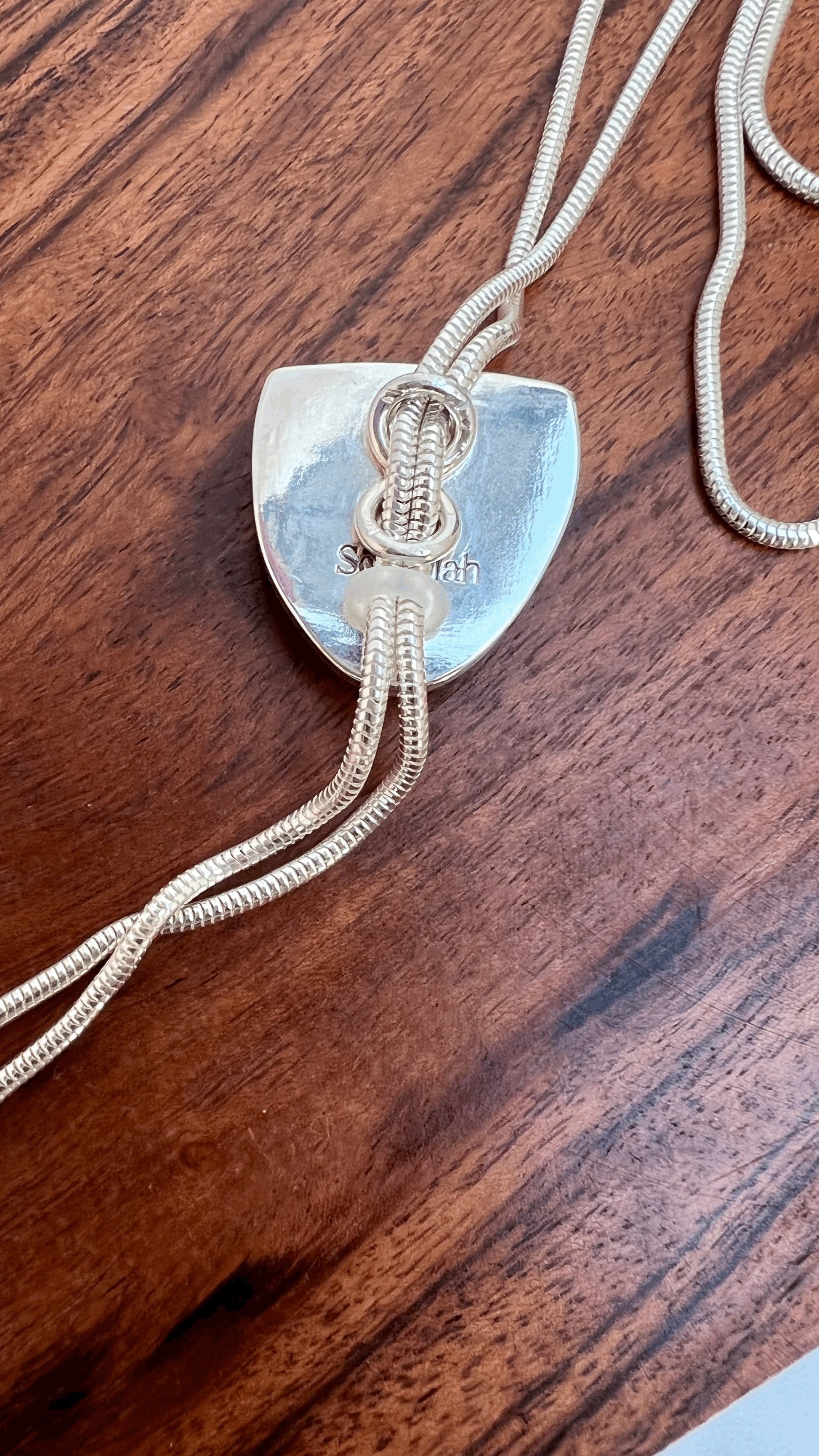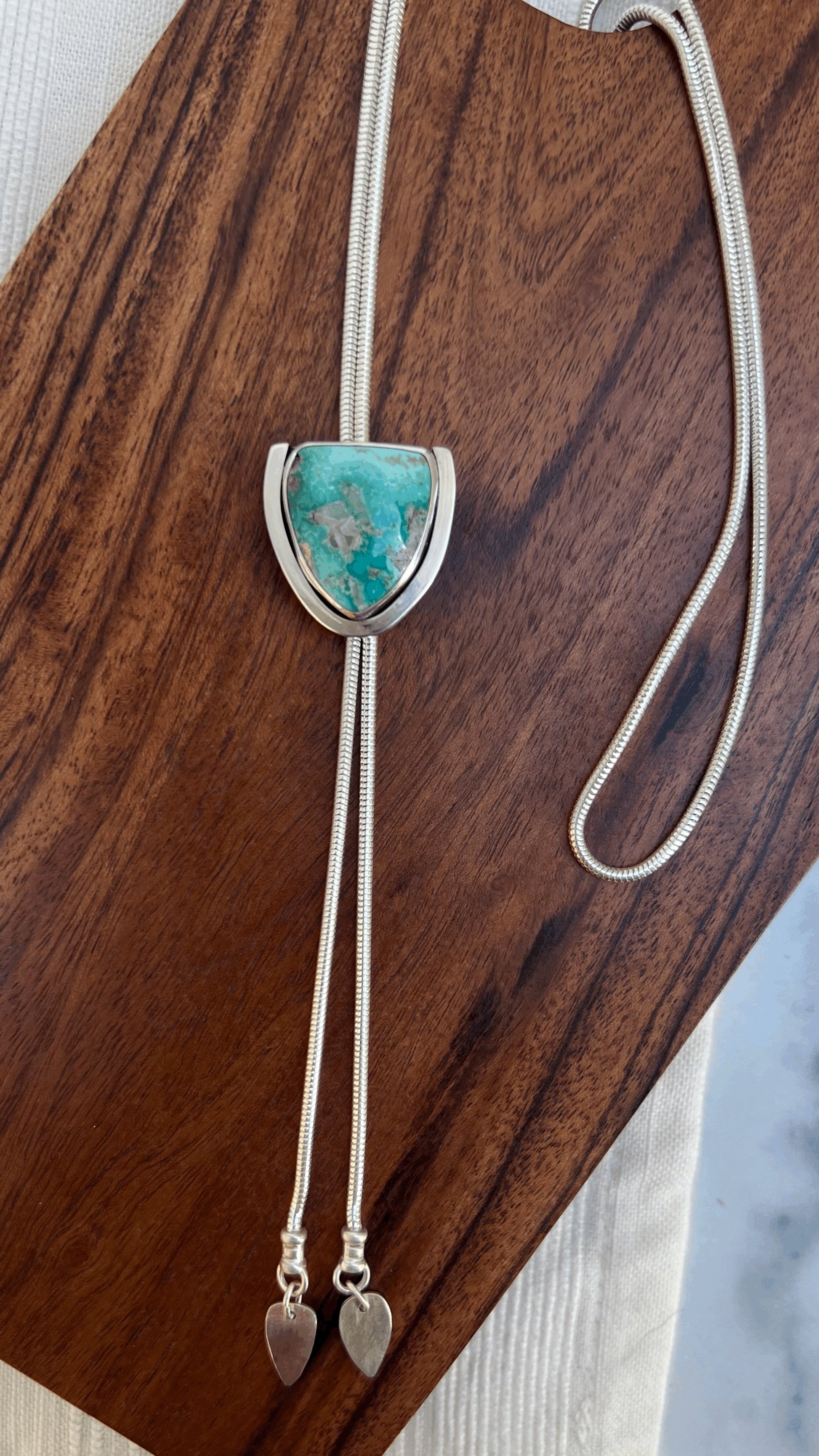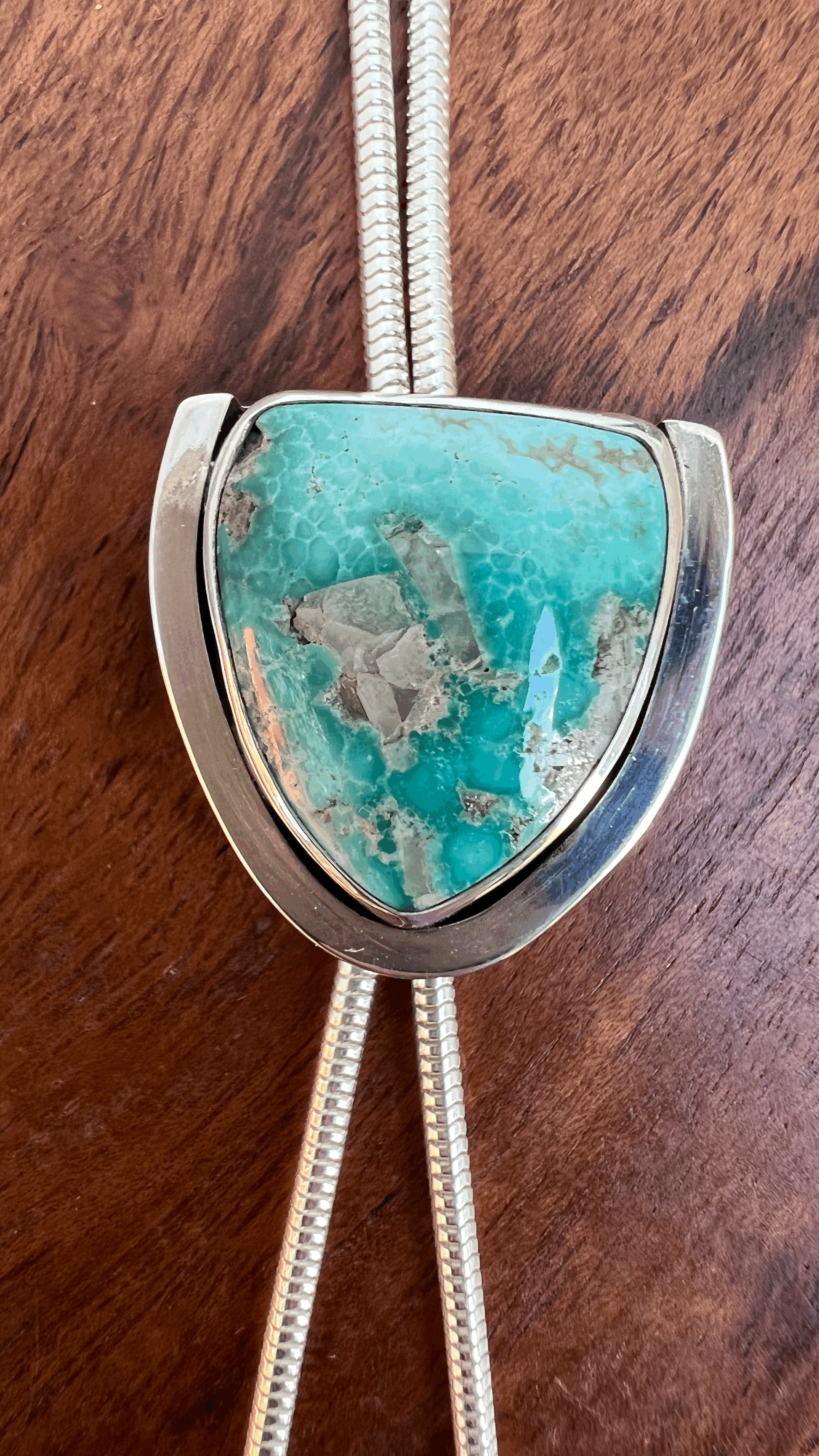 This beautiful White Water Turquoise bolo tie is easy to dress up, or down. Filled with quartz, and a noticeable quartz crystal pocket on the upper left corner of the picture.