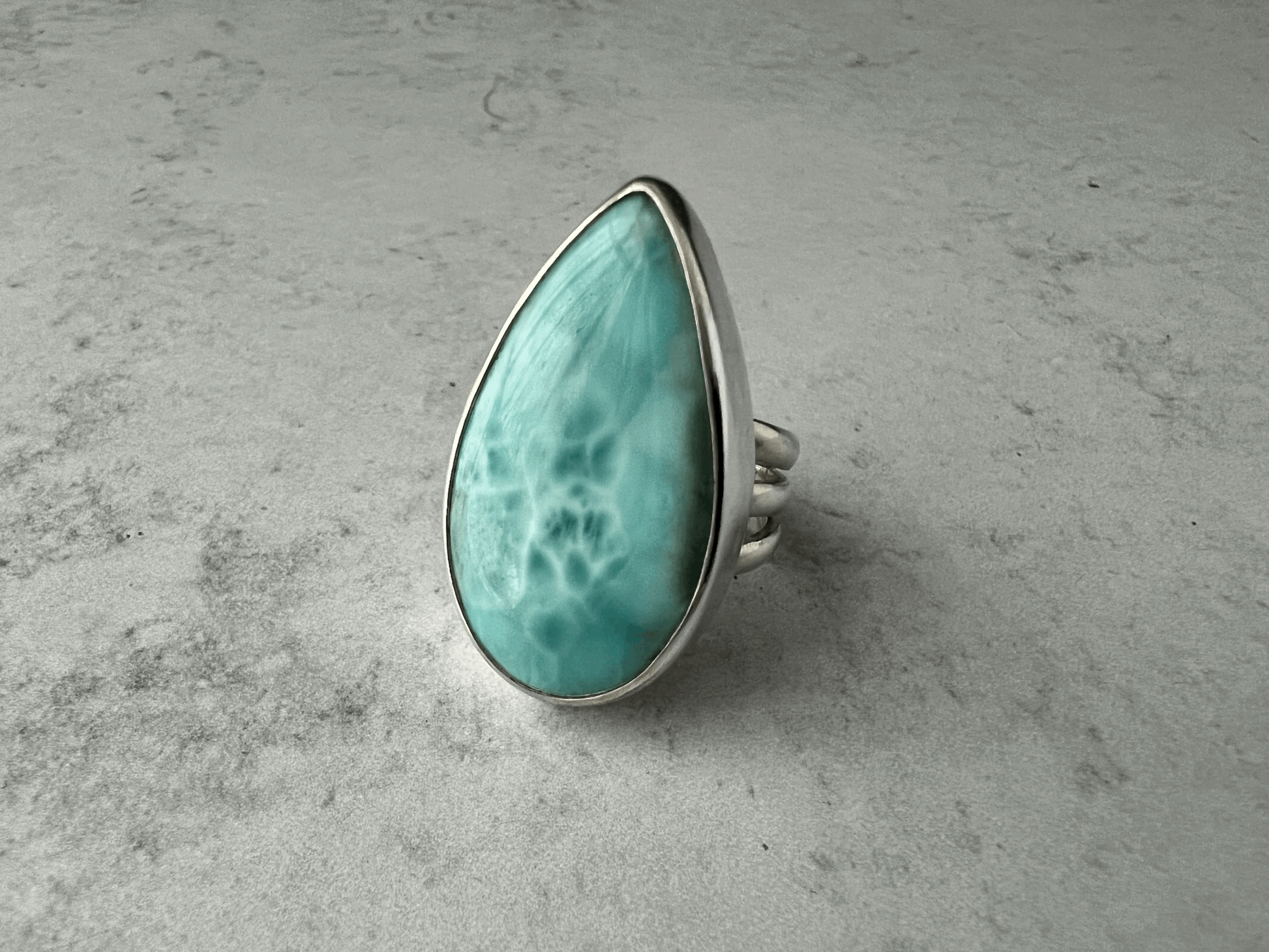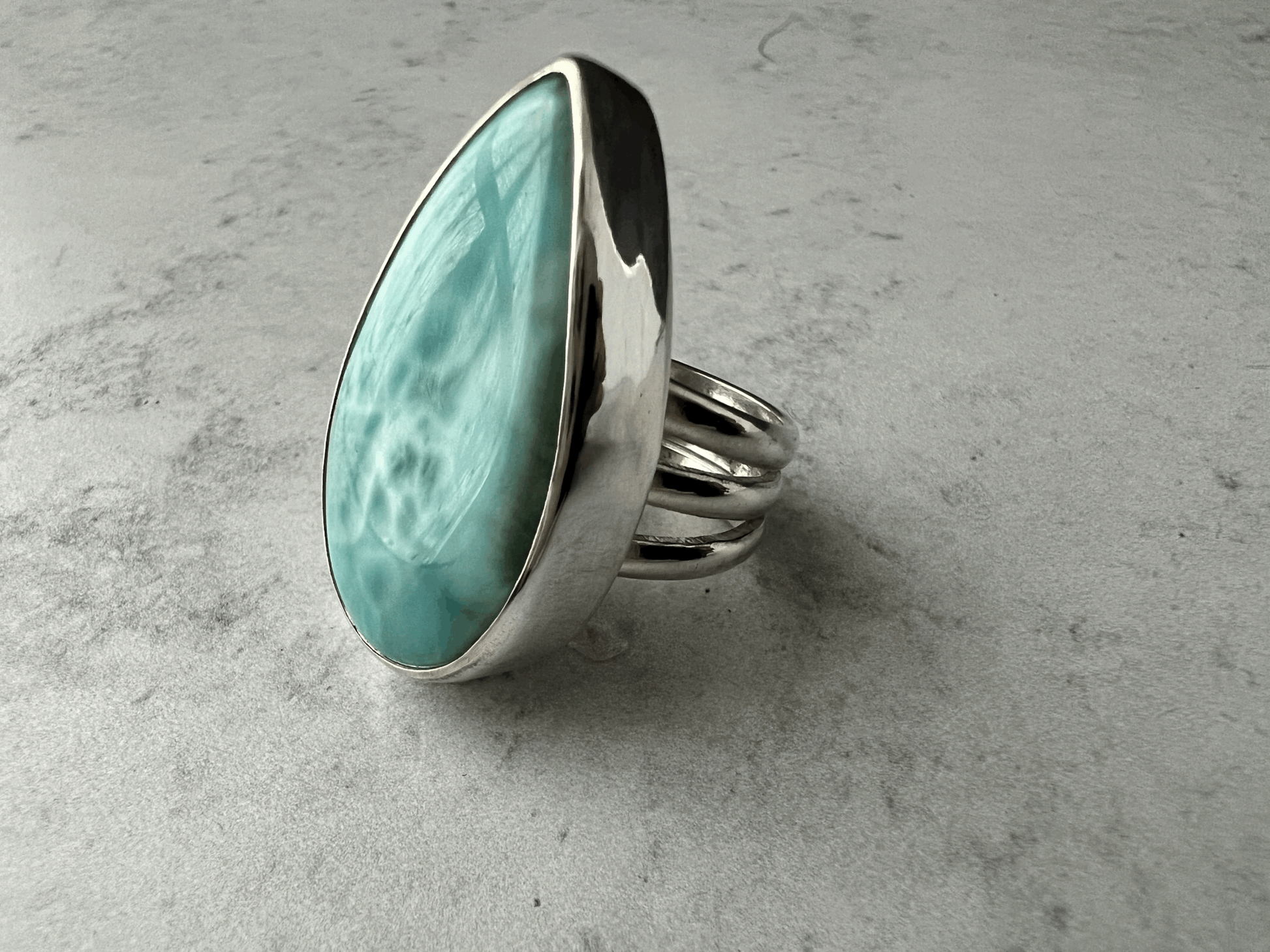 The stone of peace and tranquility, this large Larimar stone radiates calm and zen. Set in fine silver and placed upon a triple banded open shank ring band.