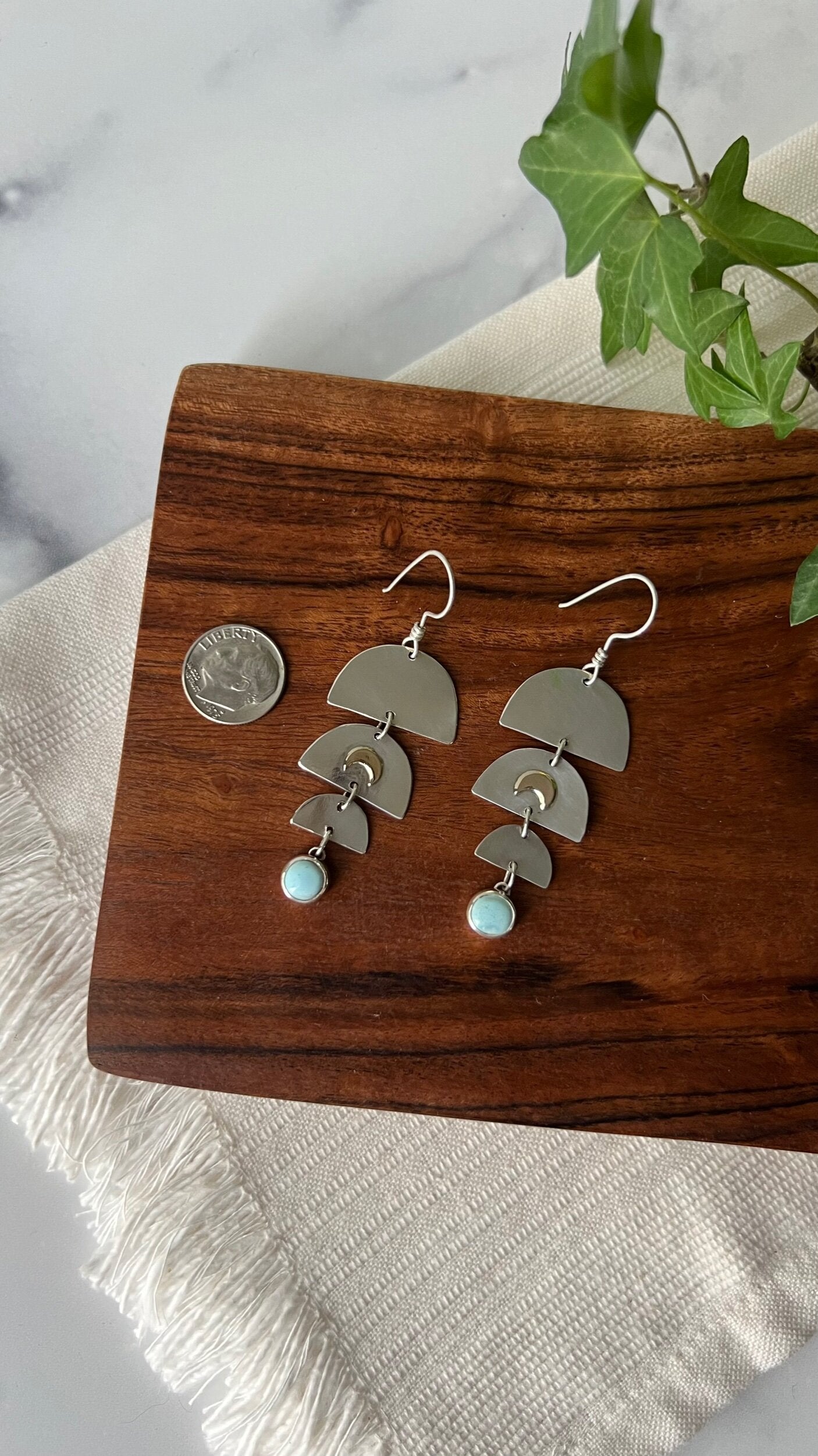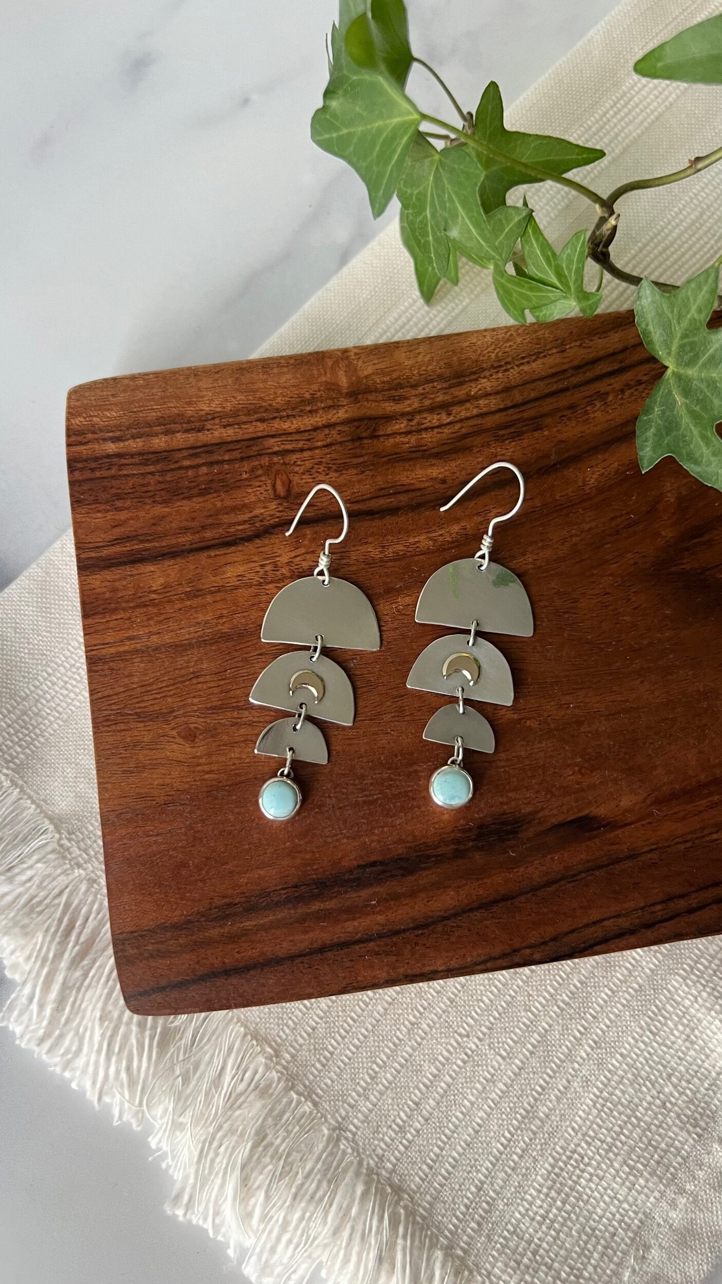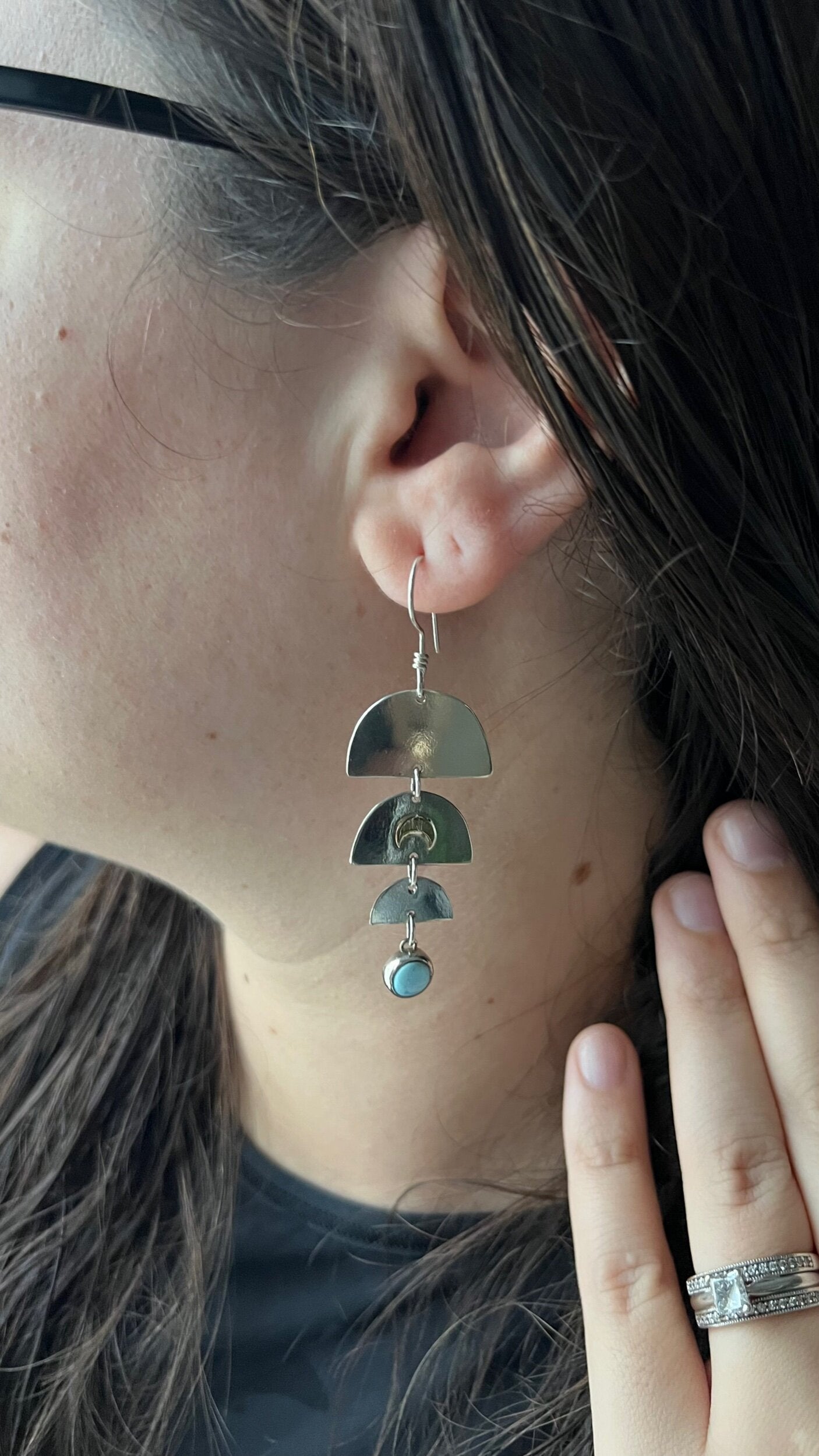 The Liza earrings are stunning statement dangles made of thick fine silver, adorned with a 14k gold moon, and paired with petite lavender turquoise stones.