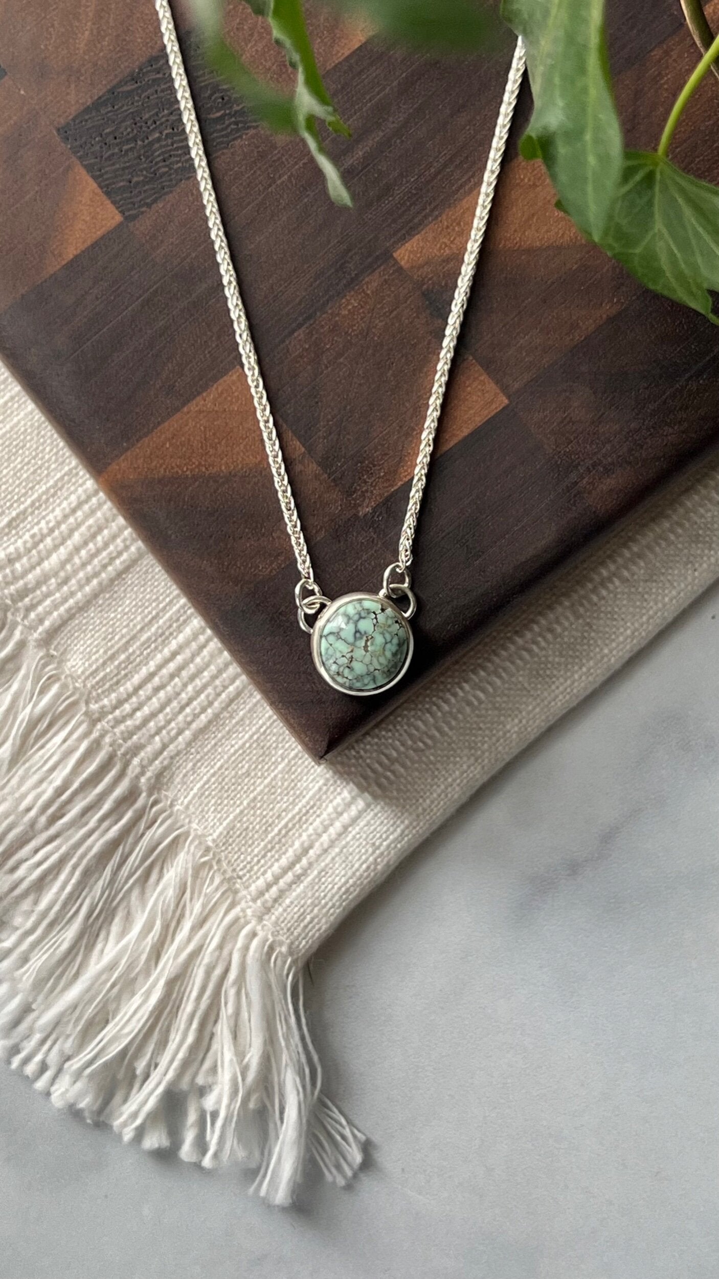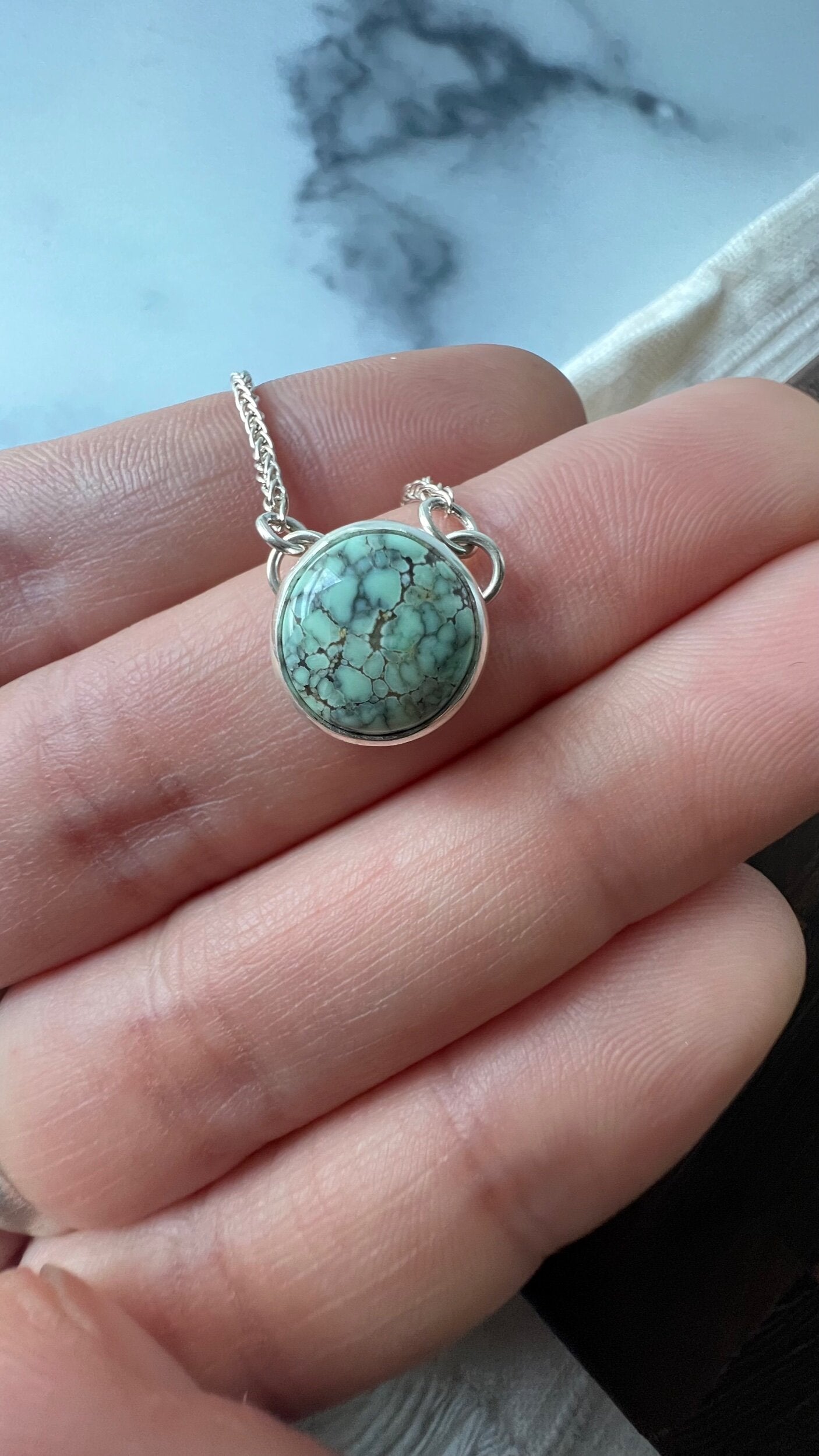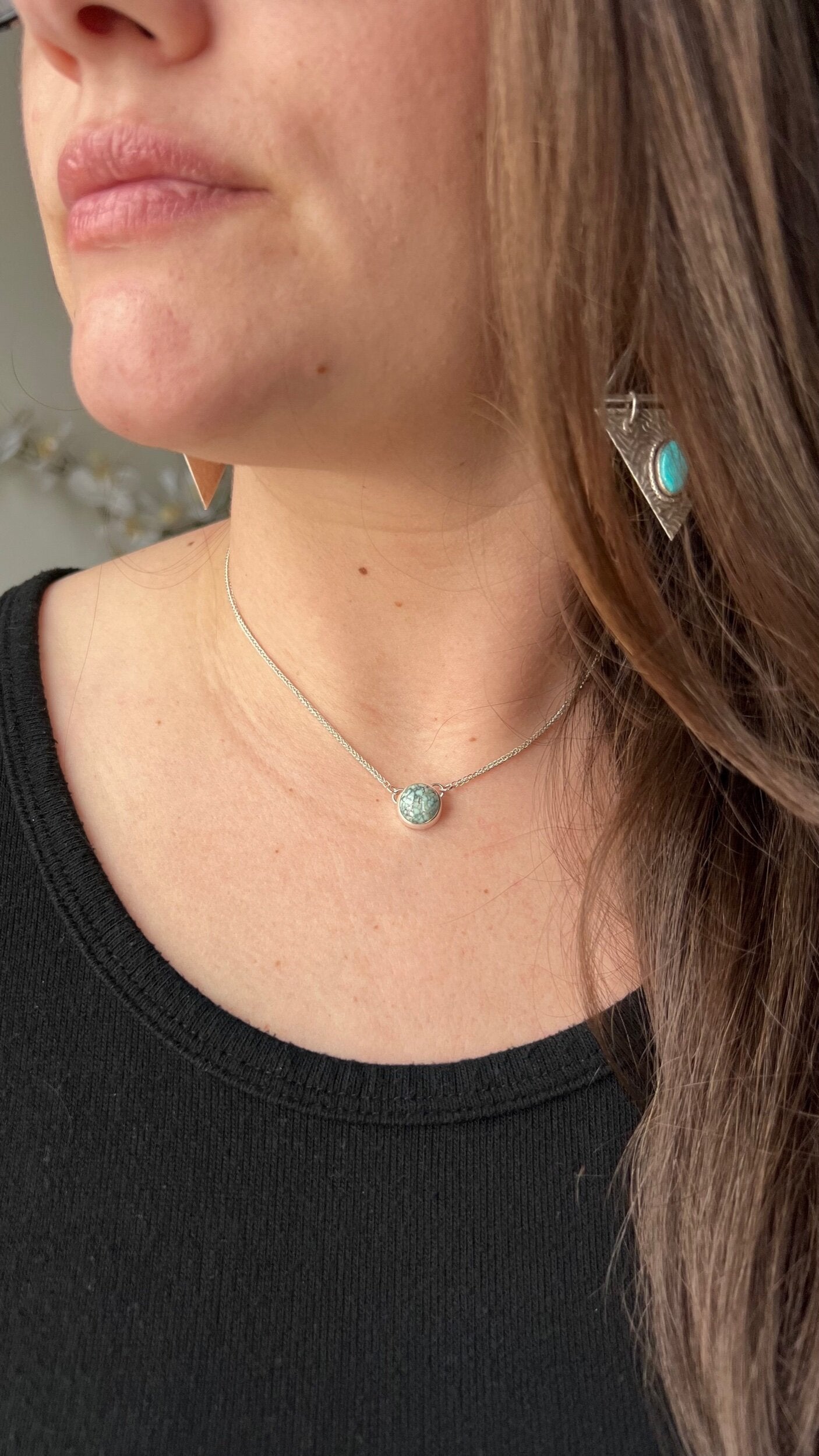 Just a perfect pop of color. This Colina verde stone is magical with it’s beautiful minty green color and dark webbing.