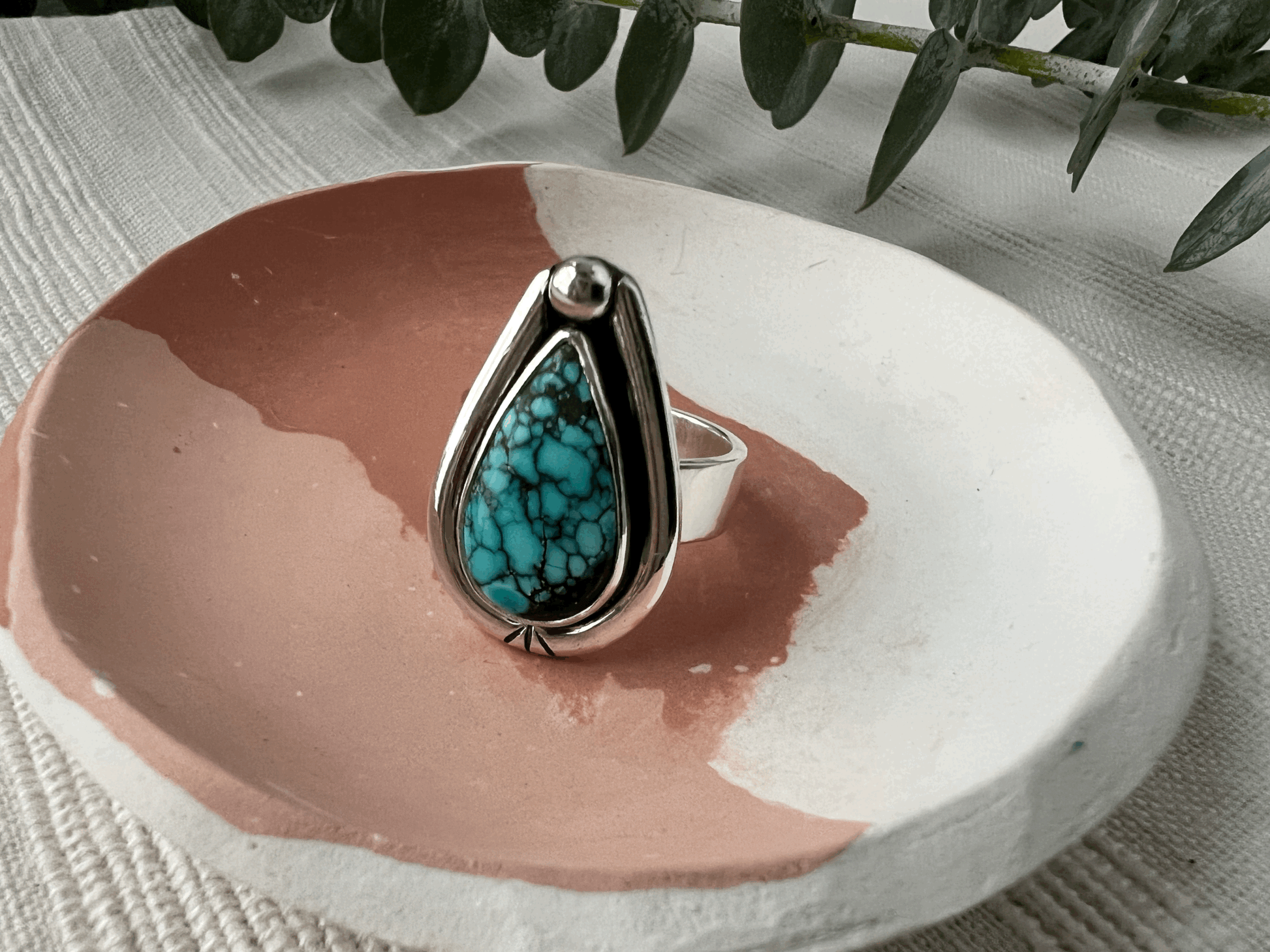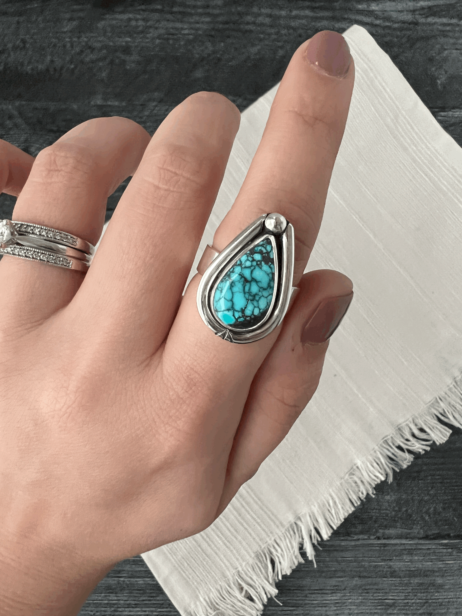 Gorgeous Blue Moon turquoise set in fine silver placed upon a 6mm wide sterling silver band. This Mondo statement ring is definitely an eye catcher.