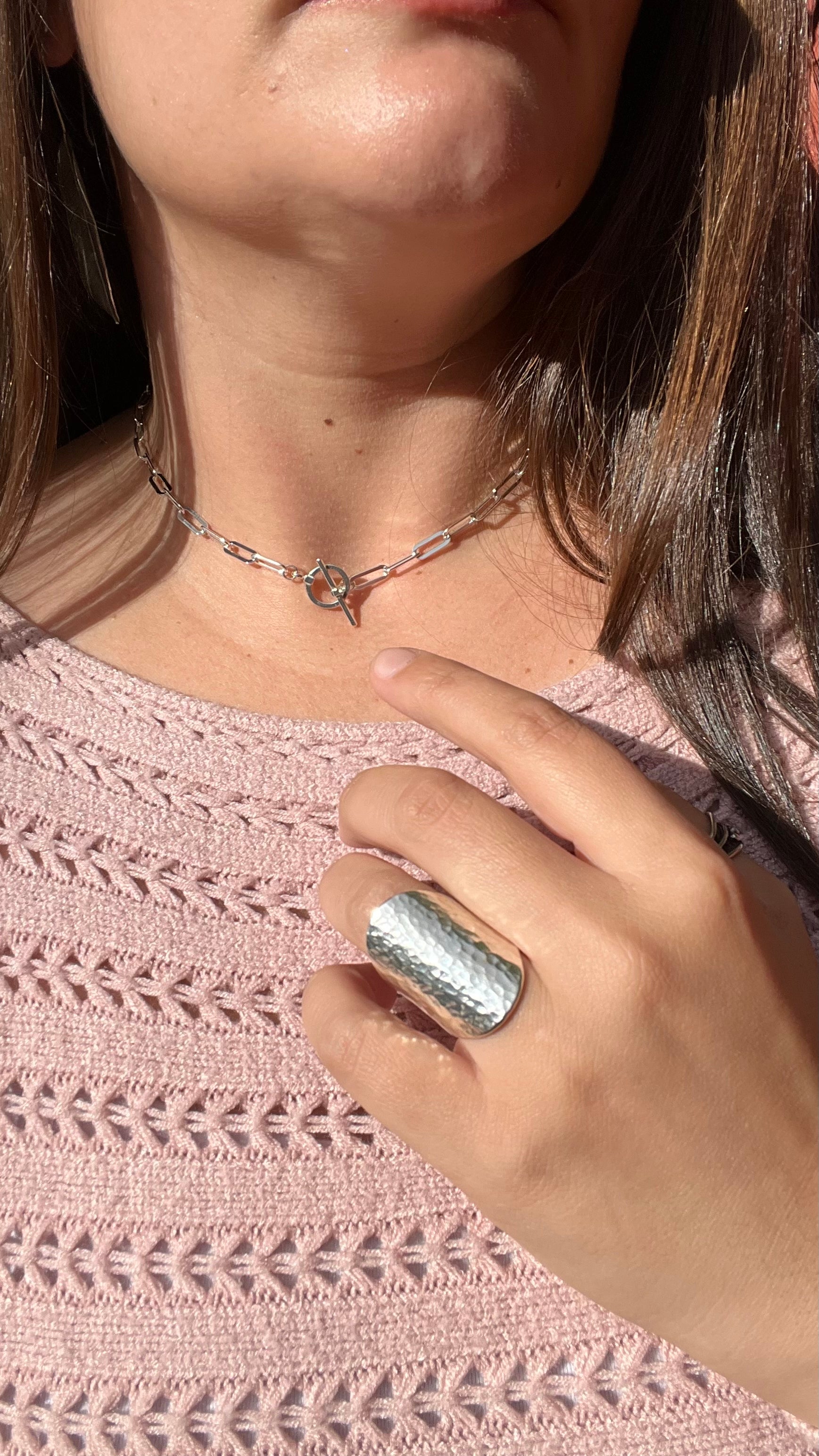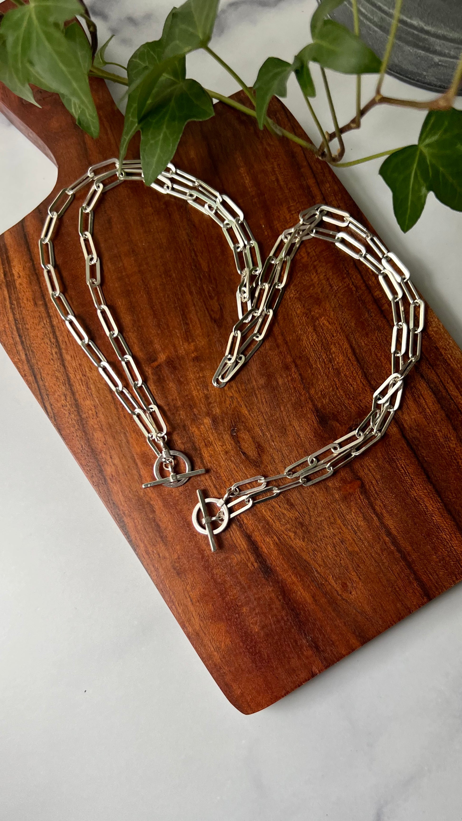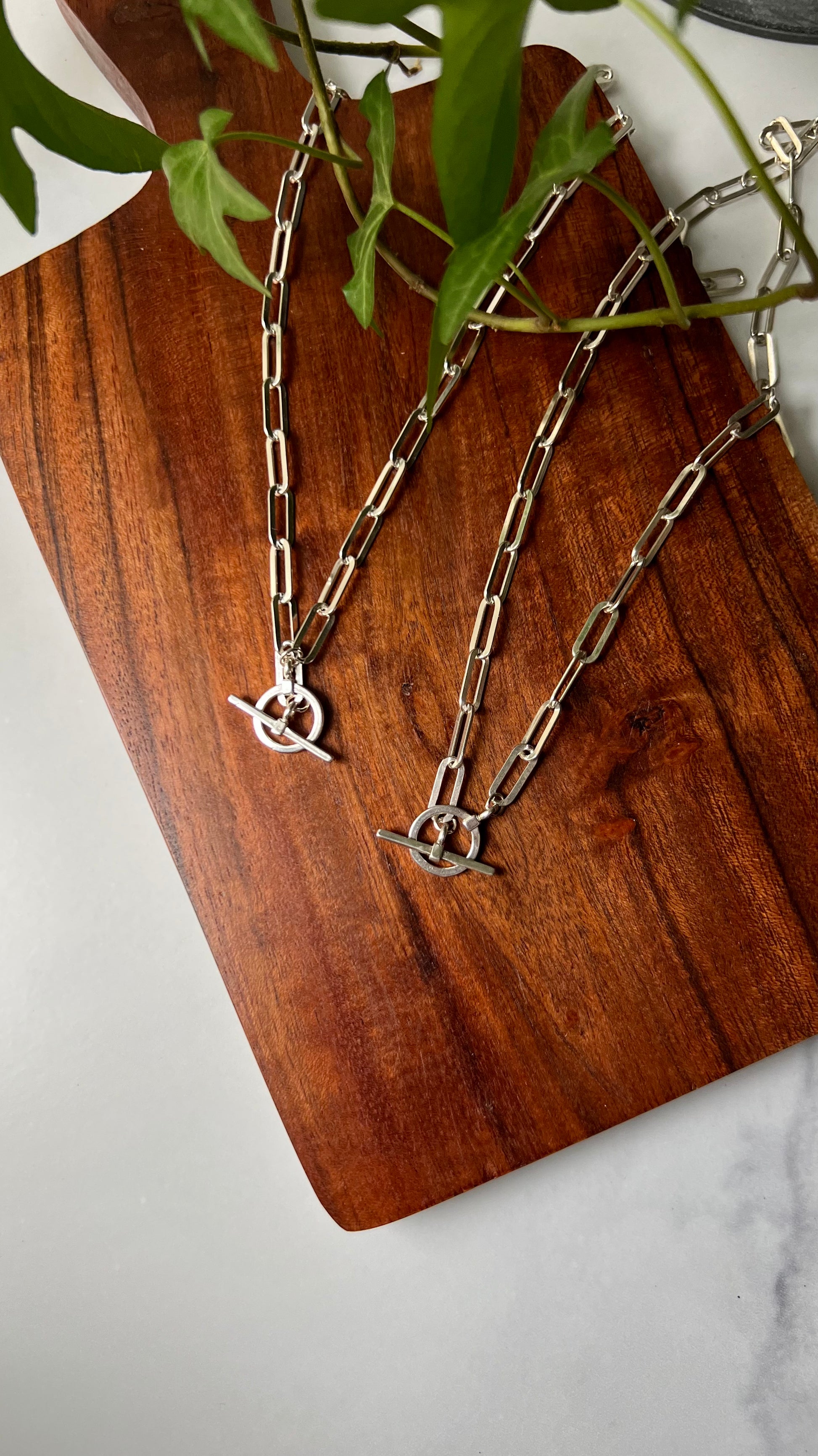 Introducing our sterling silver toggle paperclip necklace, a must-have accessory for the modern woman. This sleek and versatile chain adds a touch of sophistication to any outfit, effortlessly transitioning from day to night. Elevate your style with this chic and timeless piece.
