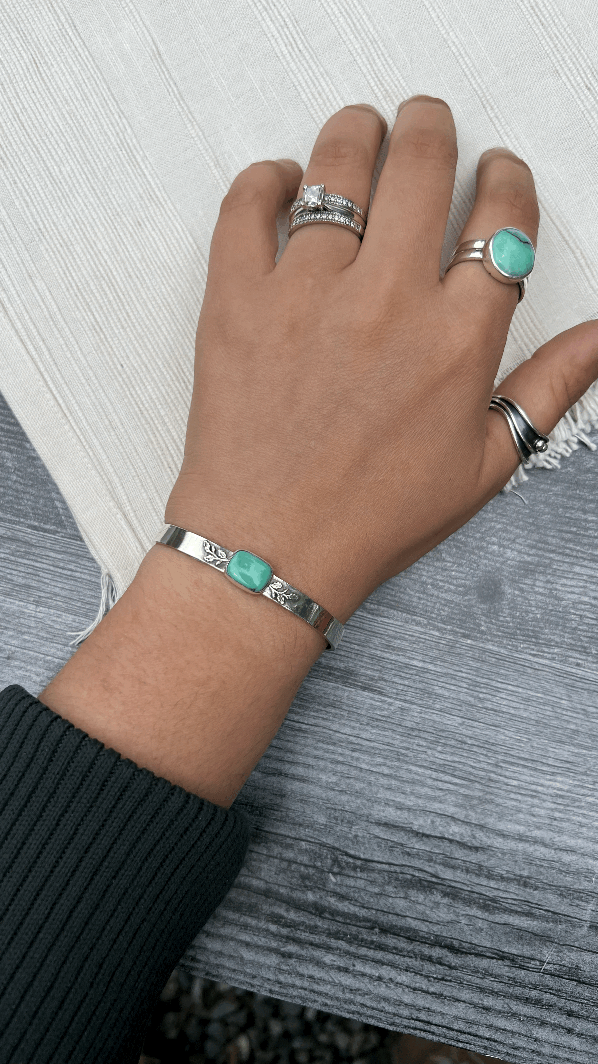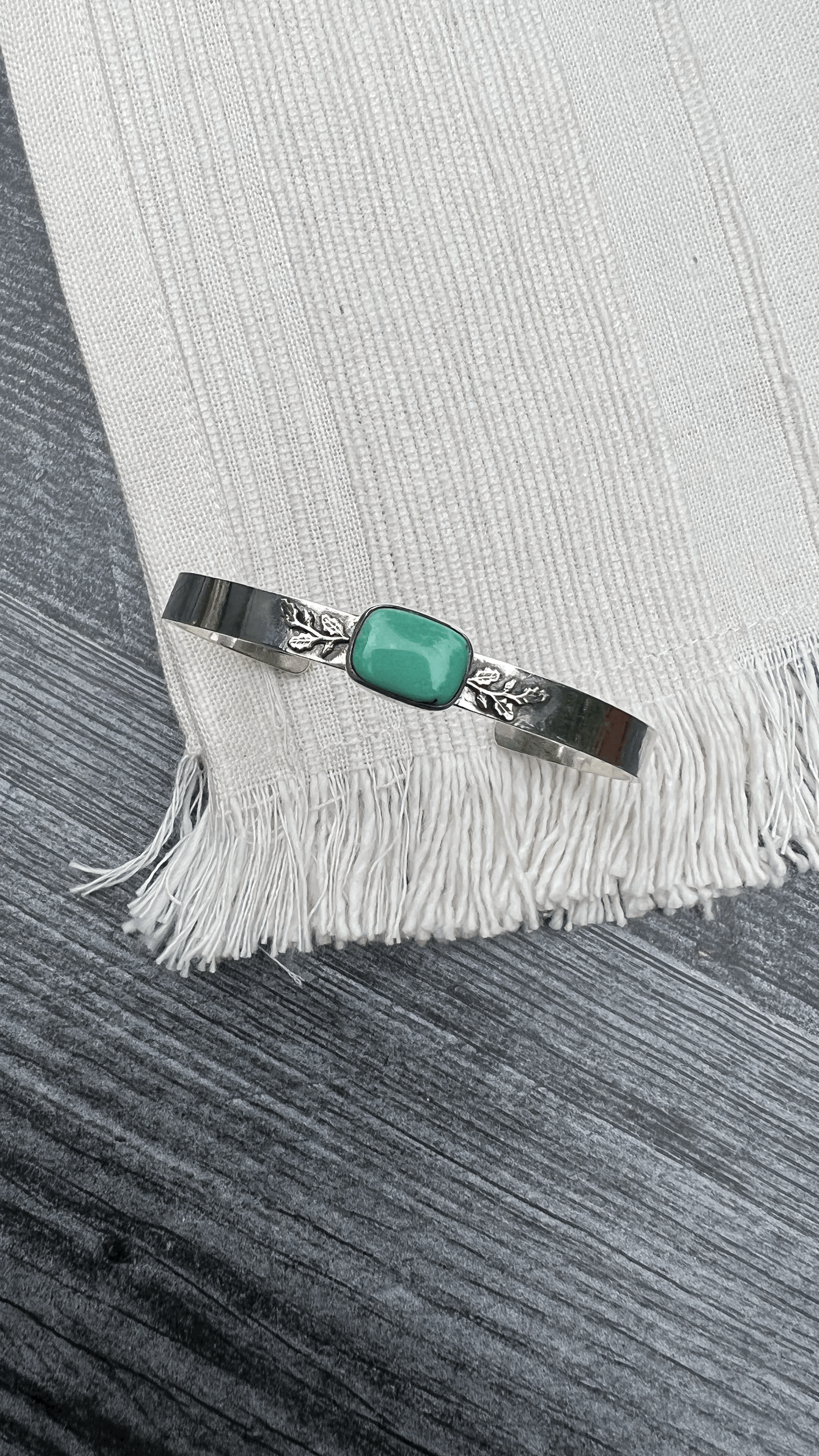 A new line up of cuffs are here! This Fox turquoise is set in fine silver and placed upon a lightly leaf textured band. Adorned with the sweetest sterling silver vine. A light patina is added to allow the textures to pop.