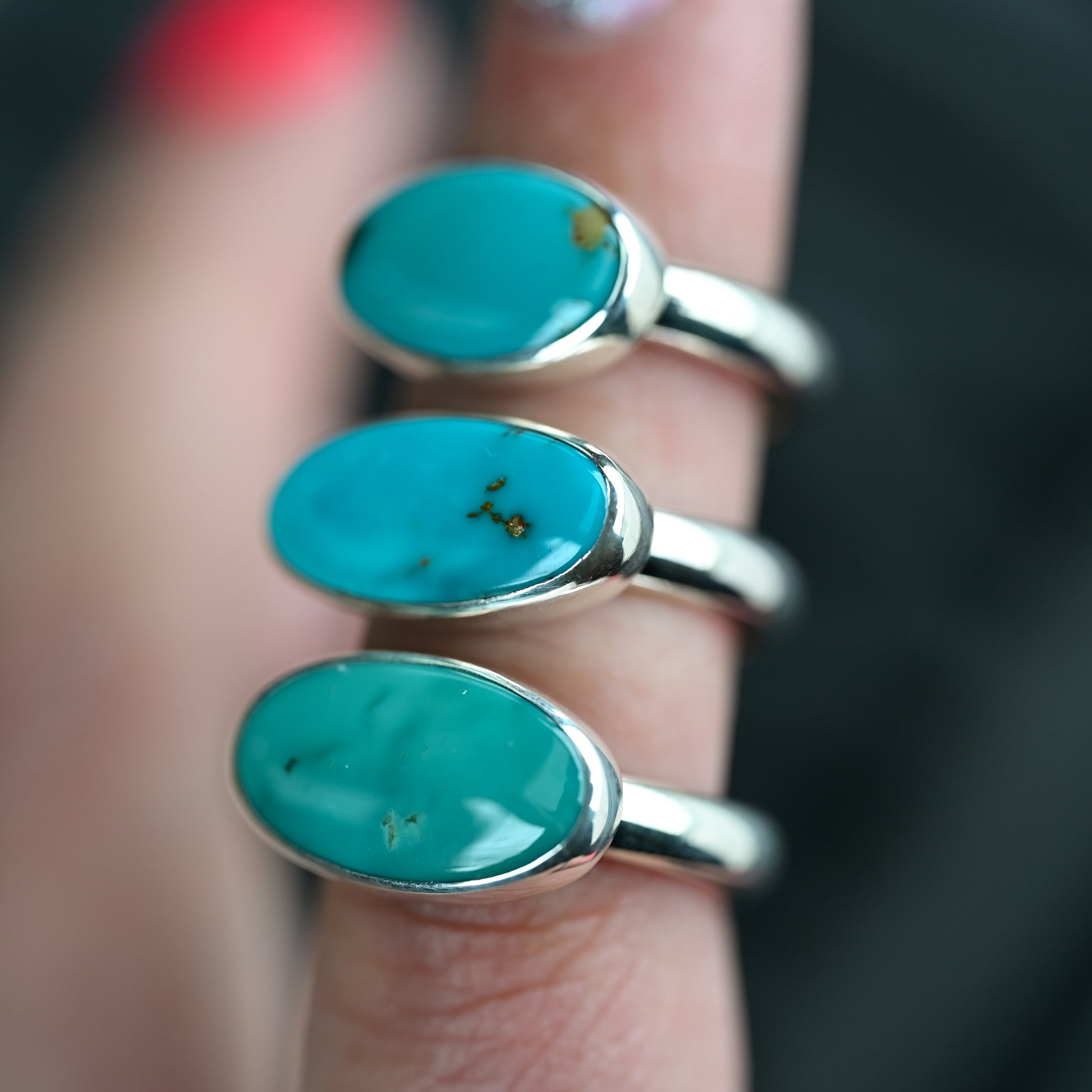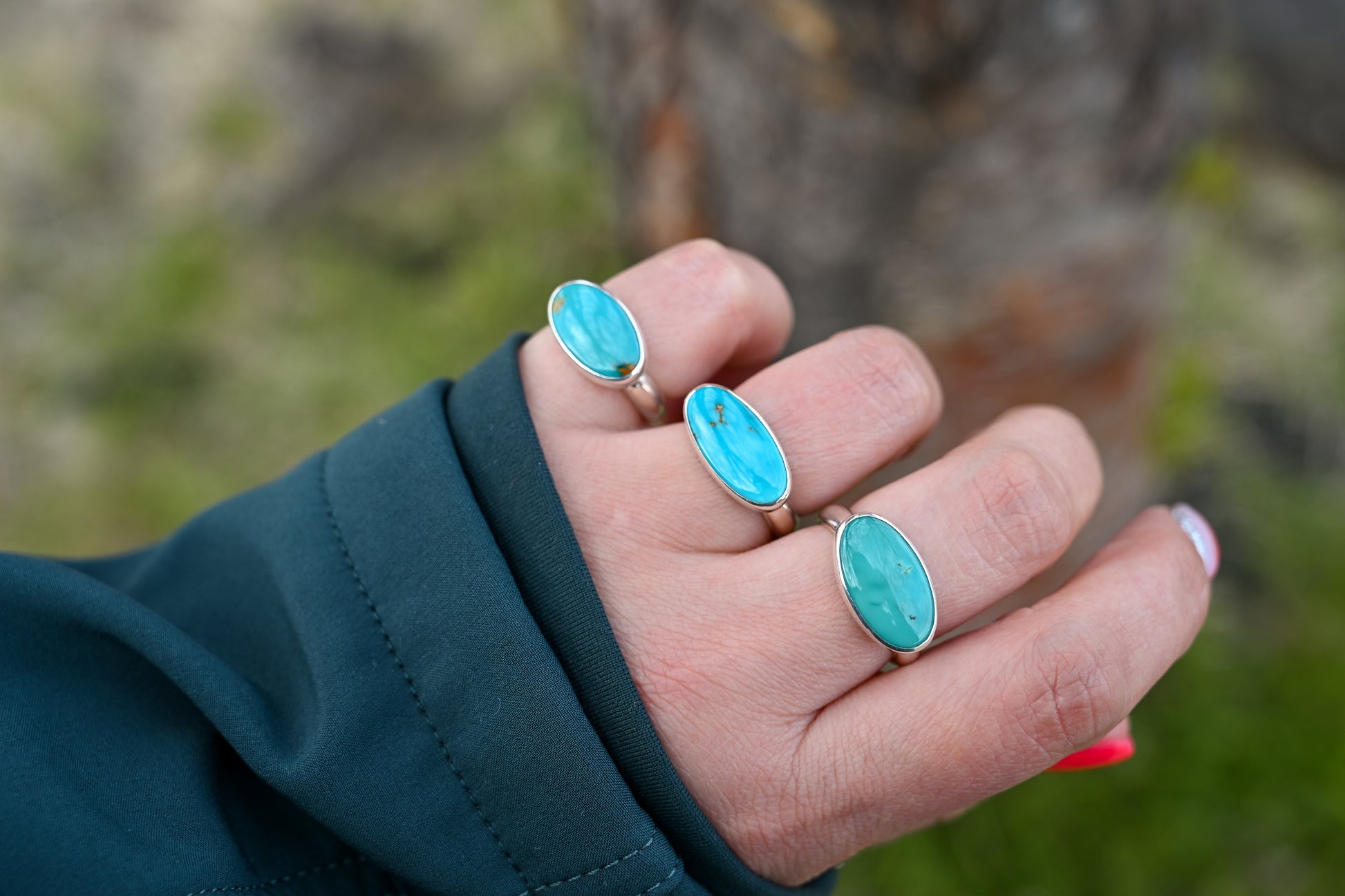 This Royston turquoise ring boasts a strikingly simple boho style. The thick single sterling silver band creates a bold statement while the horizontal stone, flush set for a seamless finish, adds a touch of natural beauty. Elevate your look with this unique and eye-catching piece.