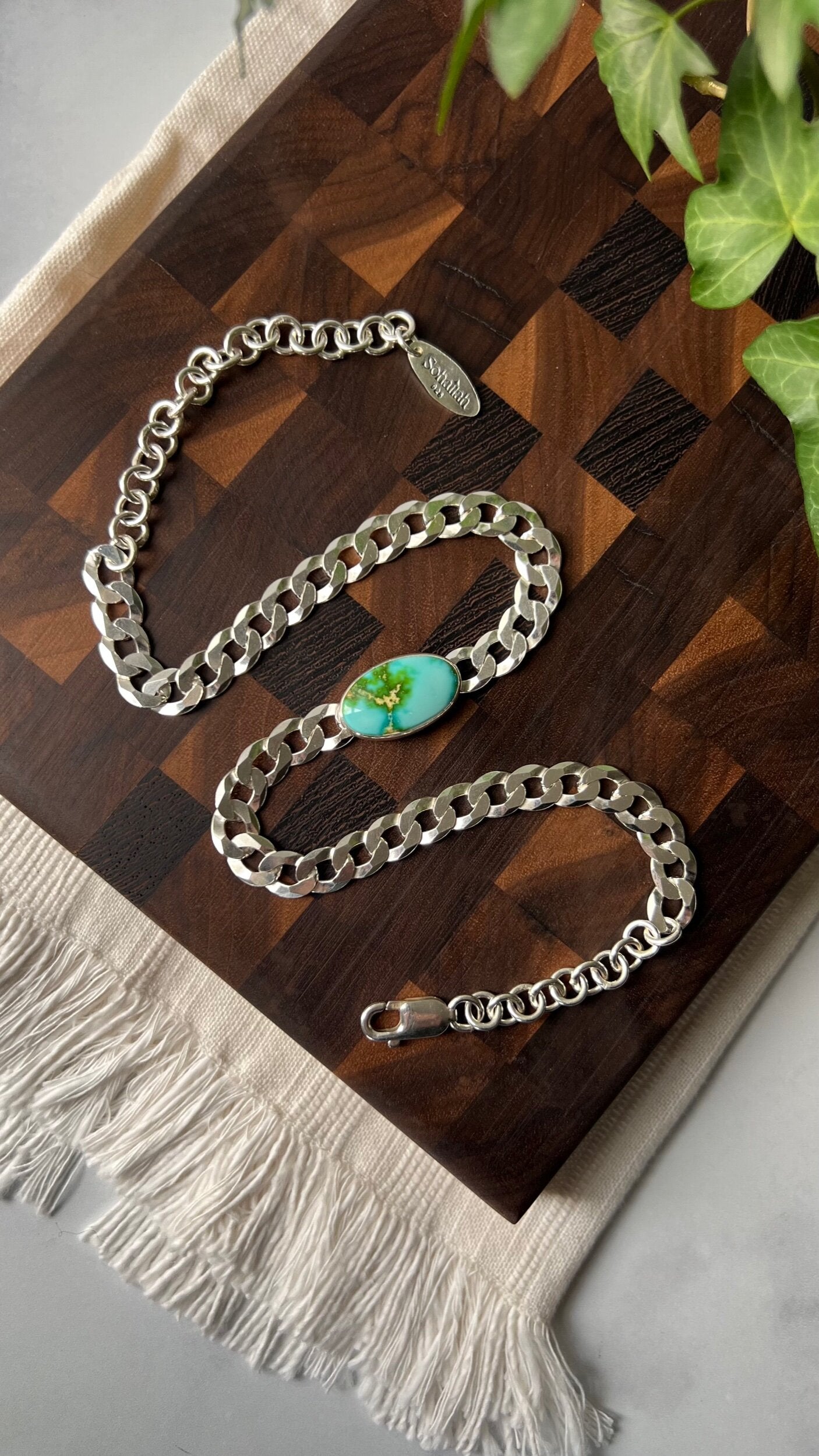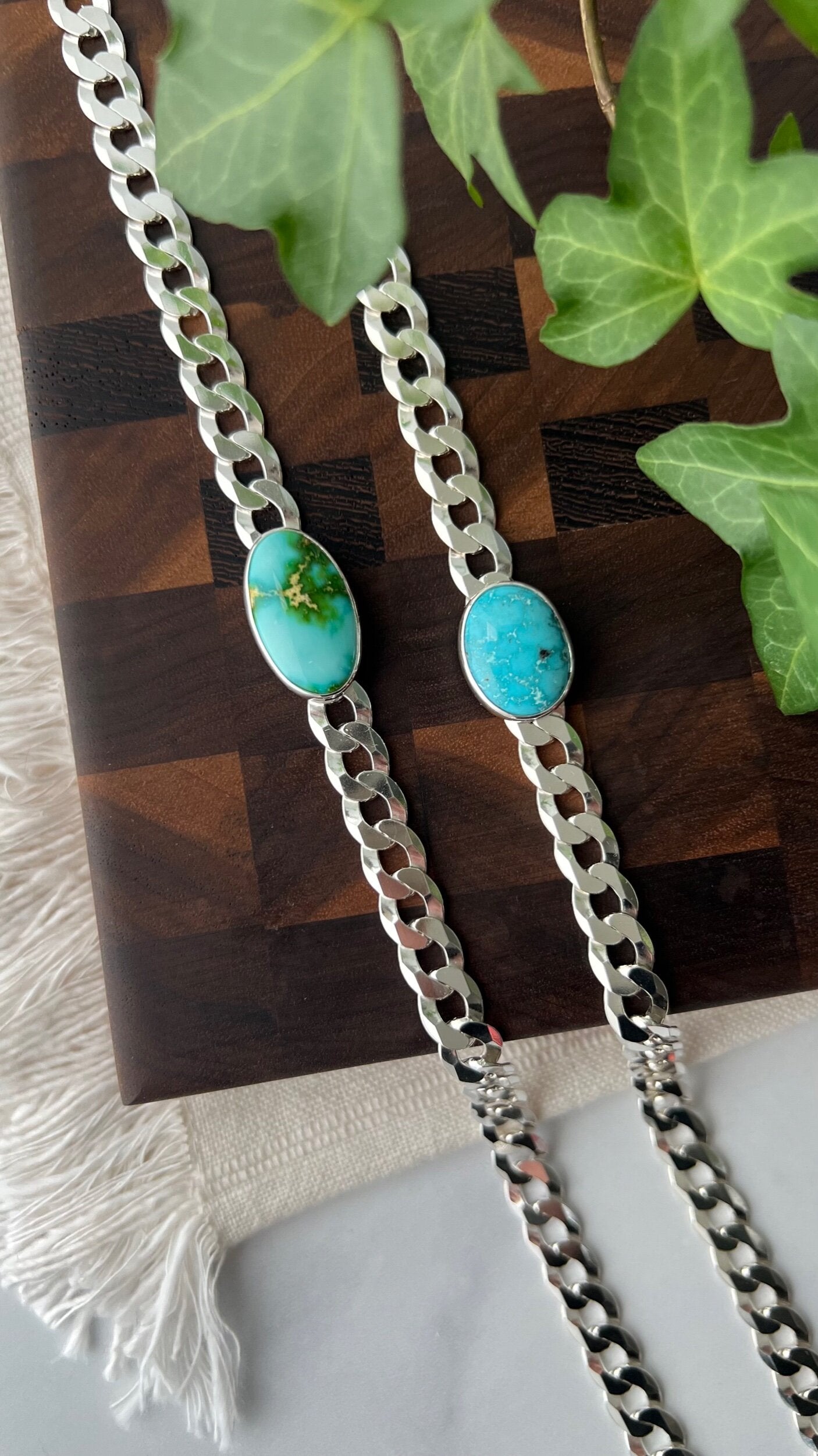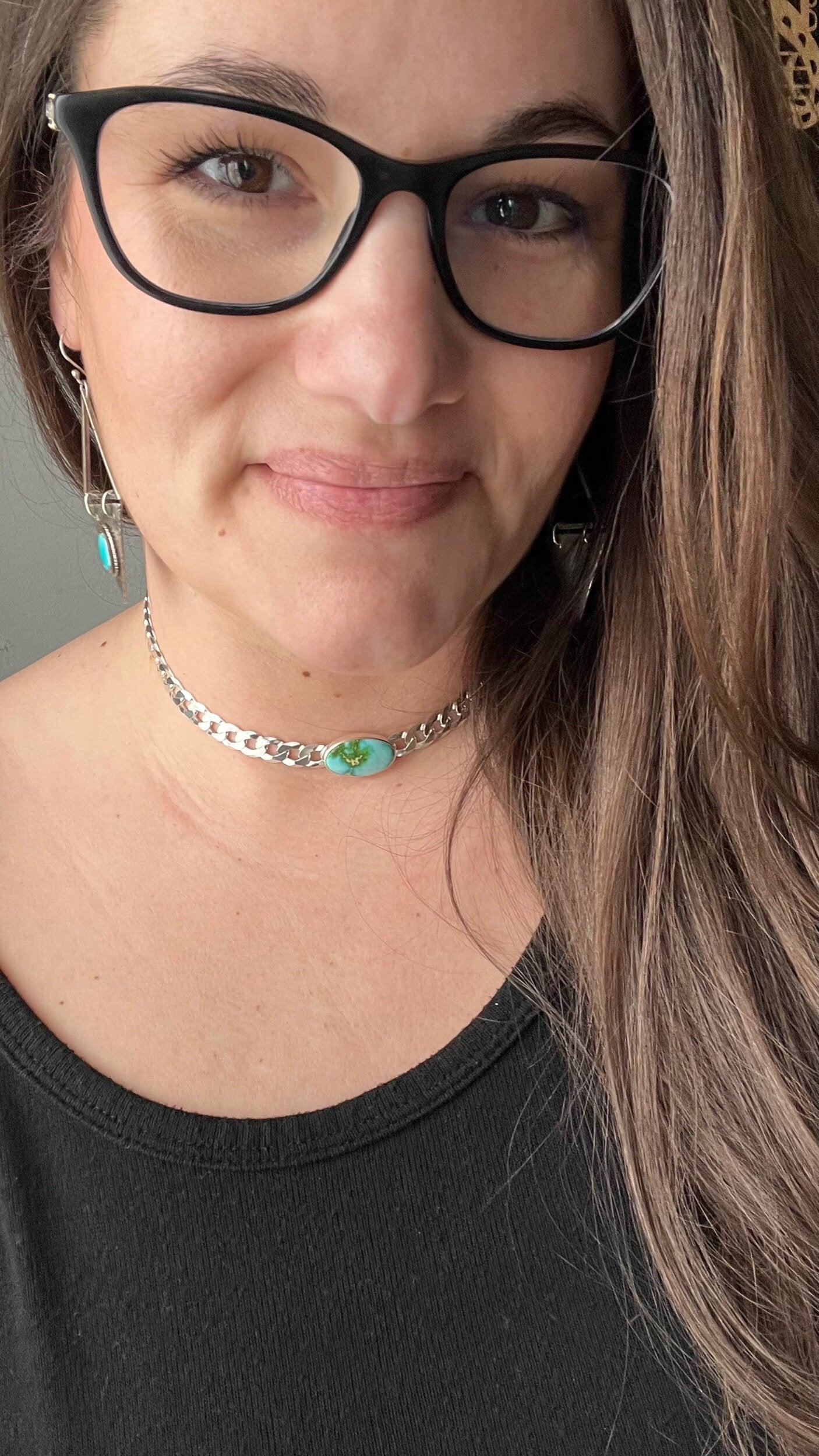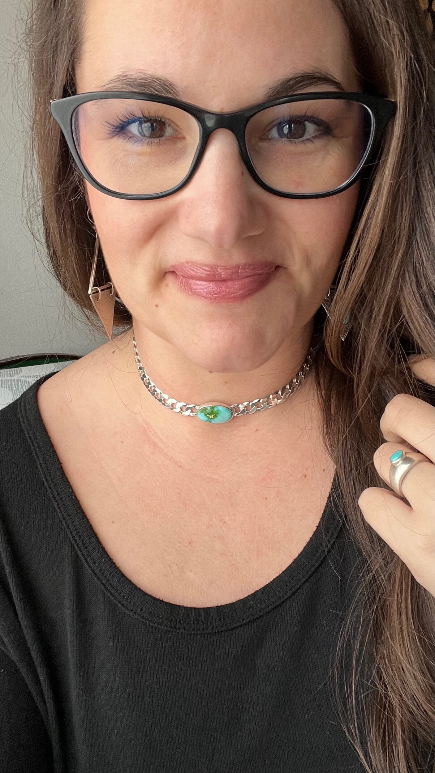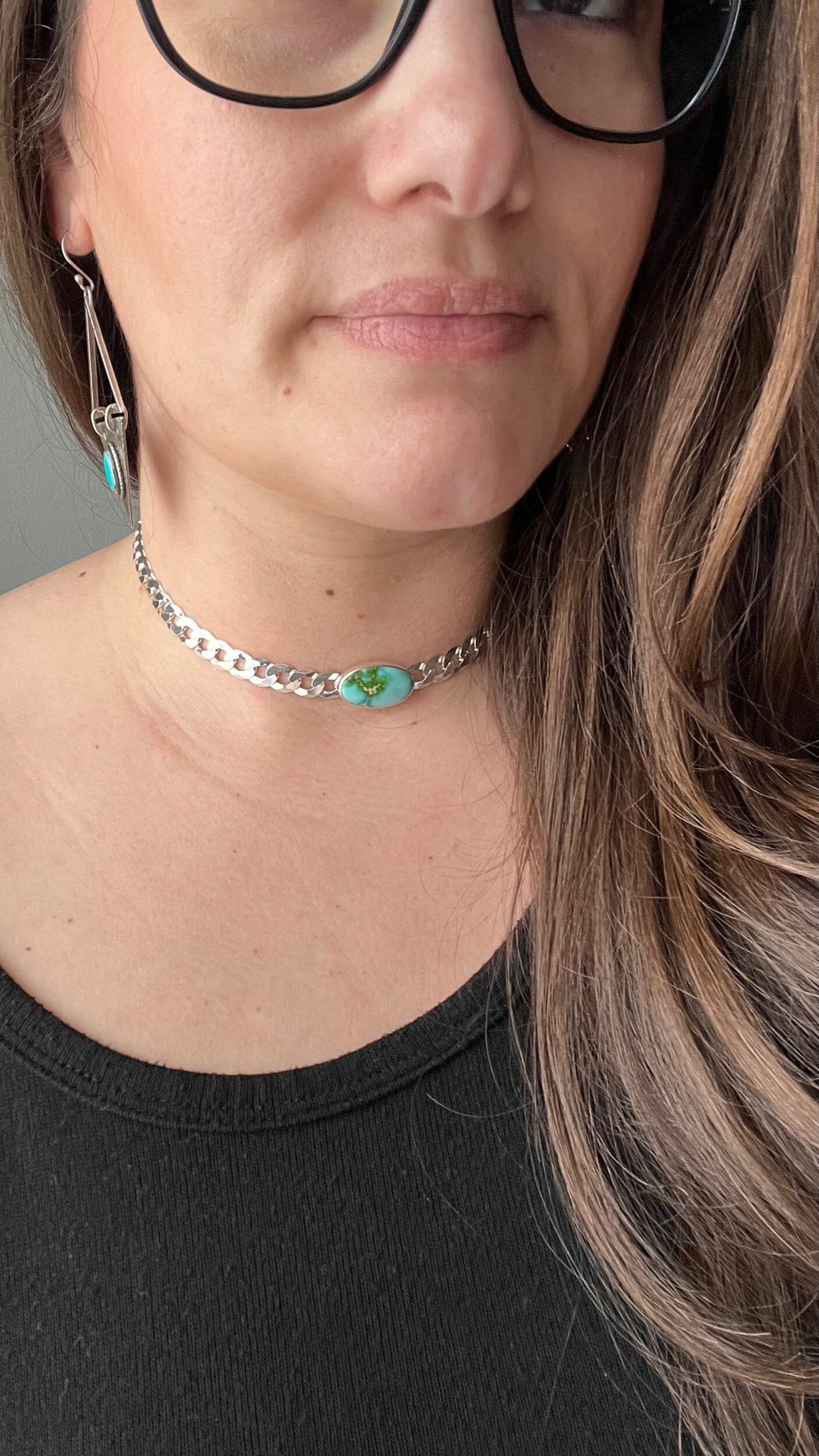 Bringing chokers back! This beautiful Sonoran Gold turquoise stone is perfectly paired with a 8 mm flat curb chain. Designed to be worn tight around the neck, this choker can be clasped down to fit your size perfectly.