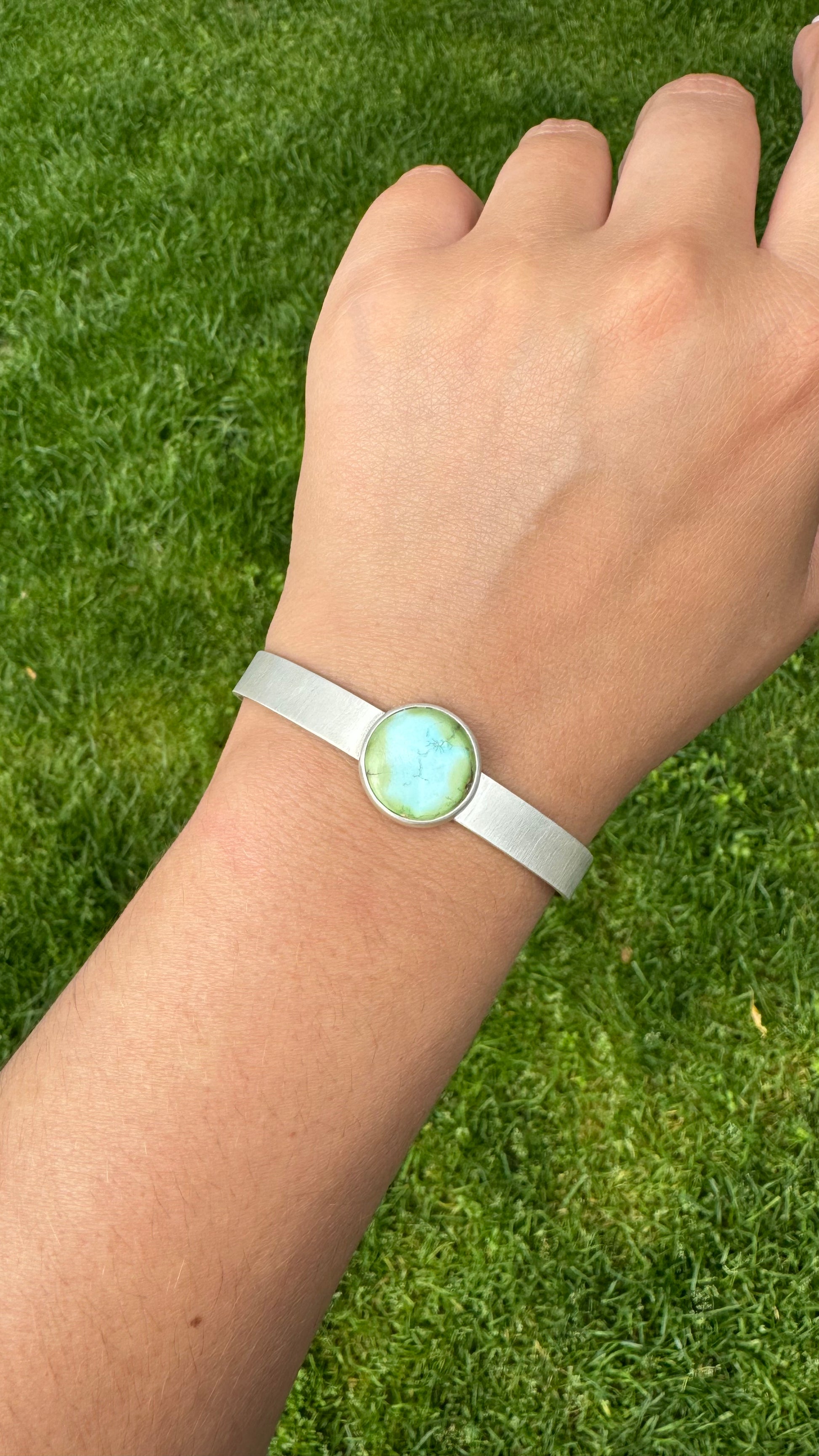 A perfectly round Sonoran Rose turquoise stone sits upon a buttery matte finished cuff. This cuff is 8mm wide and 1.5mm thick. A perfect thickness to last for years.